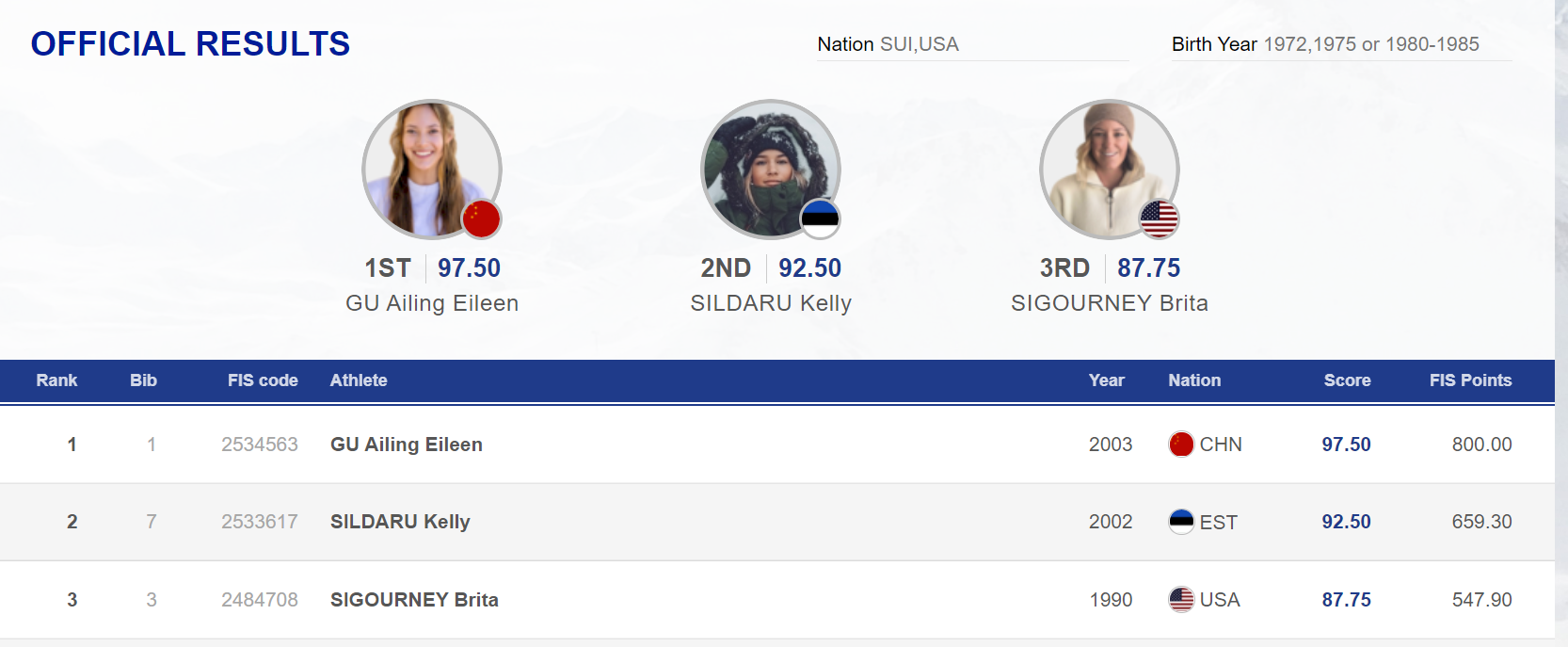 决赛原本计划于北京时间1月8日中午进行,但由于当时比赛场地出现大风,比赛被推迟至北京时间9日凌晨进行。比赛时间的变化没有影响本赛季发挥稳定且出色的谷爱凌,她在决赛中两次滑行分别获得94.75分、97.50分,最终凭借97.50分夺得冠军。爱沙尼亚选手希尔达鲁以92.50分获得亚军。