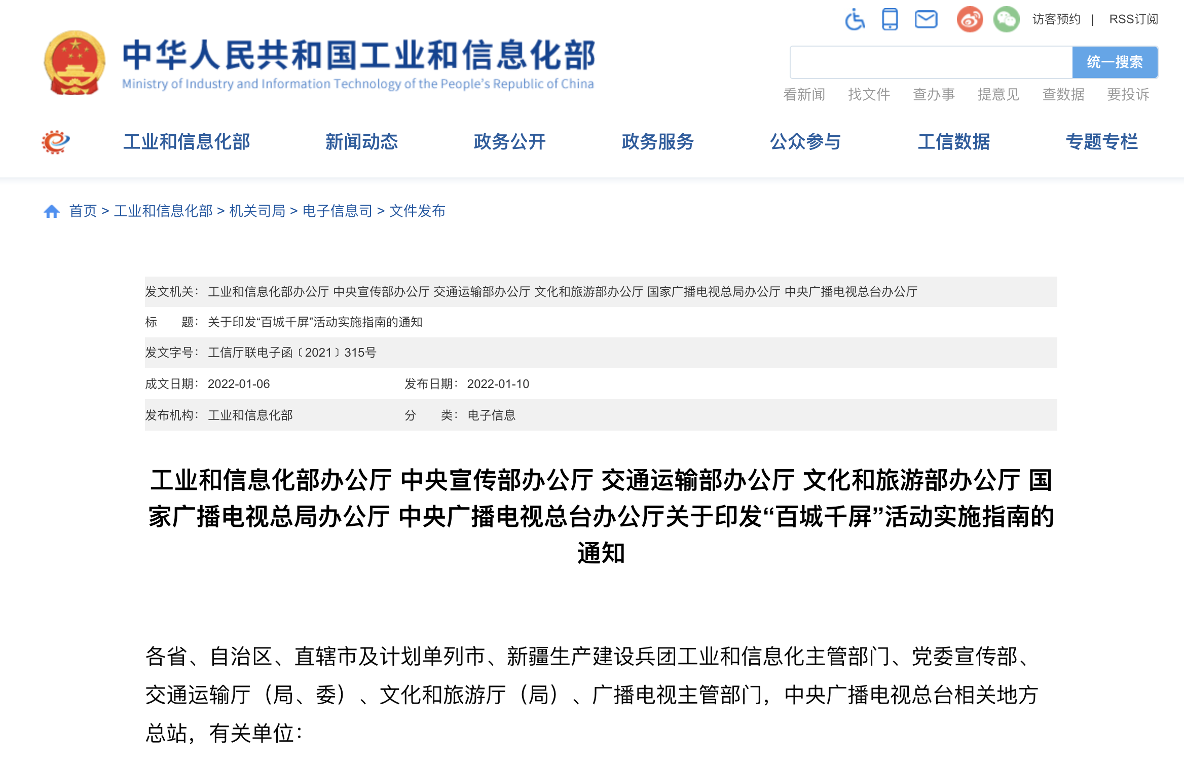 近日,工信部、中央宣传部、交通运输部、文化和旅游部、国家广播电视总局、中央广播电视总台等六部门联合印发《“百城千屏”活动实施指南》,表示将通过新建或引导改造国内大屏为4K/8K超高清大屏,丰富超高清视音频服务场景,加速推动超高清视音频在多方面的融合创新发展,催生新技术、新业态、新模式。