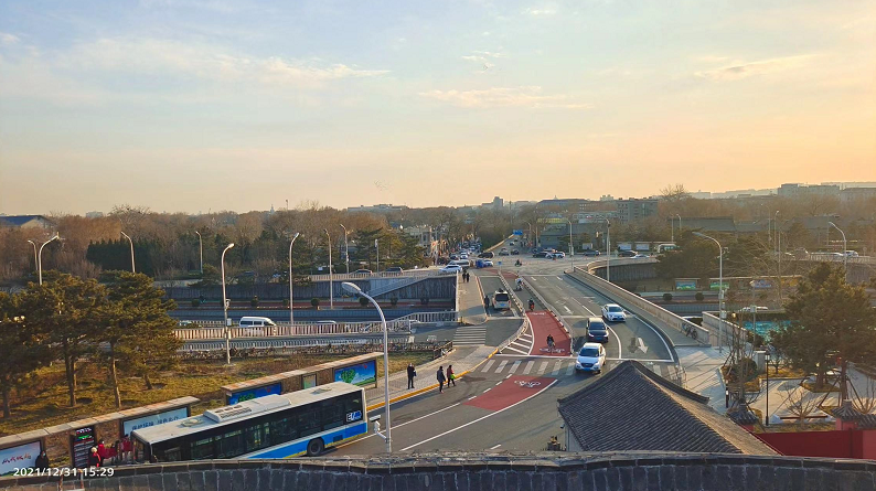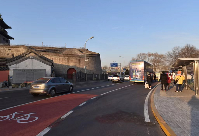 此外,为提升立交桥区慢行出行品质,本次工程因地制宜,实施“一桥一策”,完成德胜门桥、马甸桥、上清桥等4座立交桥区改造。针对德胜门桥区存在多路口交叉、慢行路径不清晰、步道宽度过窄、公交进出站困难、高峰期交通拥堵等问题,将西南角步道宽度由原3.3米拓宽至6米,东侧人行步道由3米拓宽至4.3米。同时,将德胜门箭楼东西两侧公交站及非机动车道进行拓宽改造,改造前站台人行道宽度仅1.8米,无法满足乘客候车及行人通行需求,本次将公交站台宽度拓宽至4米,并增设了3.5米公交港湾及3米非机动车道,增加了路面彩色铺装,保障非机动车路权。