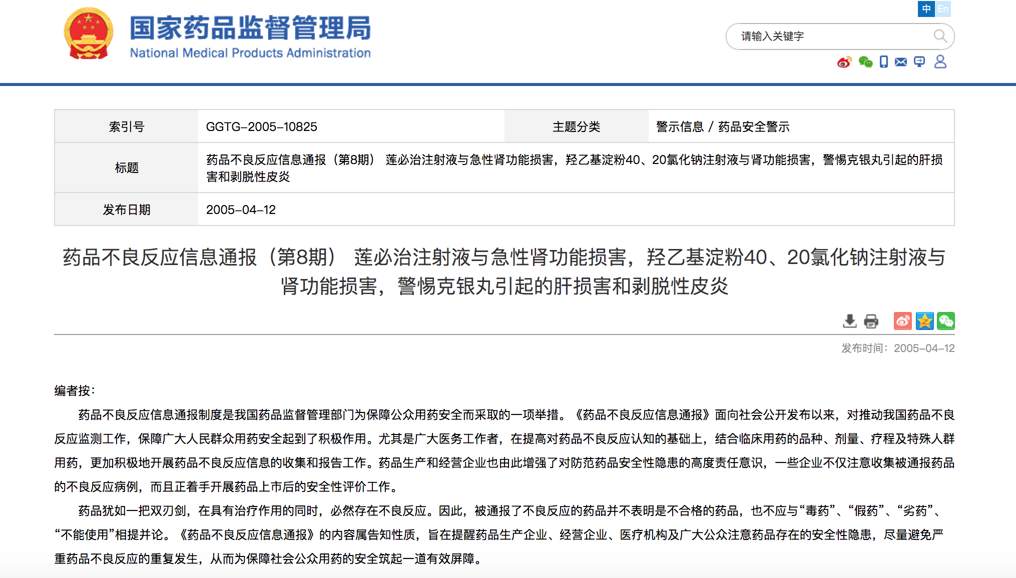 1月11日,记者在国家药监局网站搜索“莲必治”关键词,共发现三条相关消息。除了11日发布的公告外,剩余两条分别是2006年发布的“关于修订莲必治注射液说明书的通知”和2005年发布的“药品不良反应信息通报”。