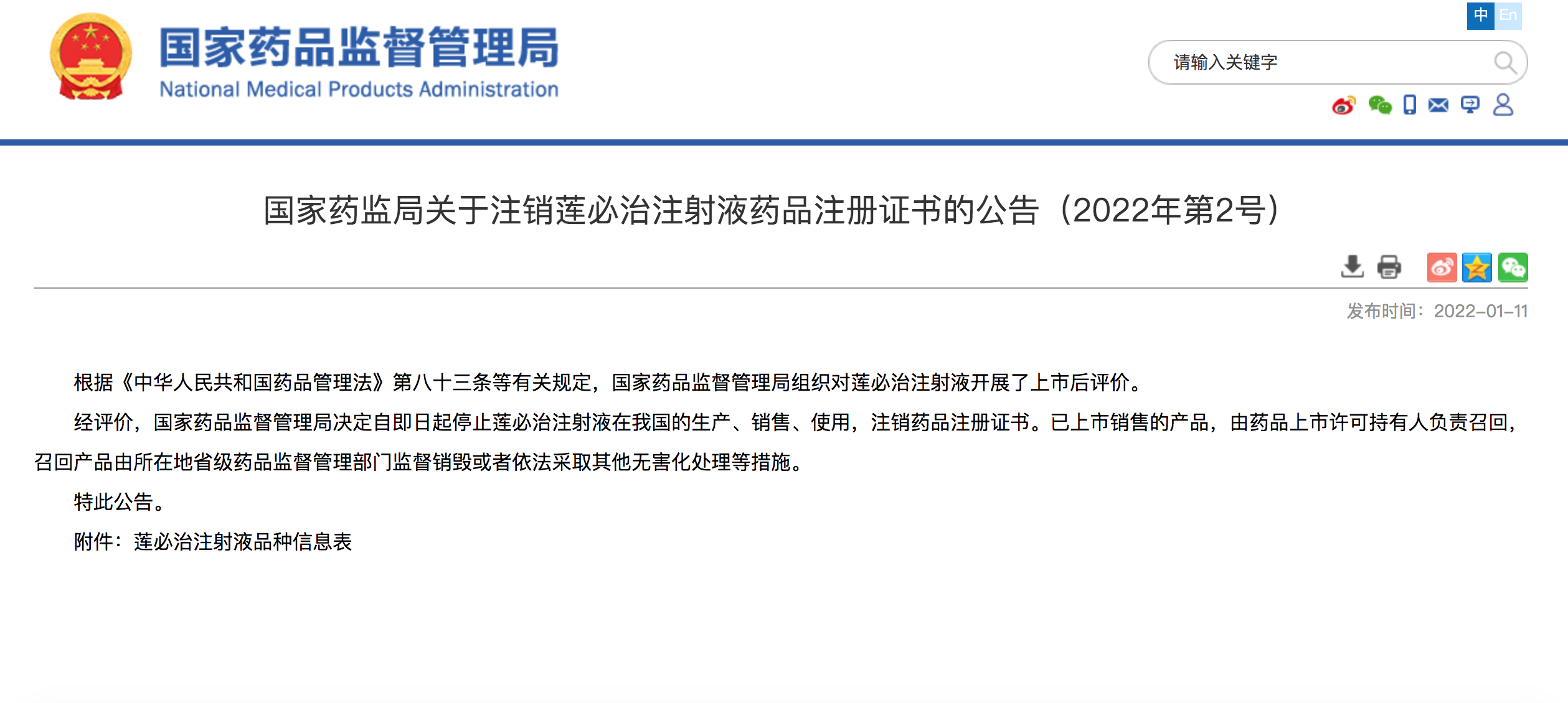 1月11日,国家药监局发布公告,即日起停止莲必治注射液在我国的生产、销售、使用,注销药品注册证书。