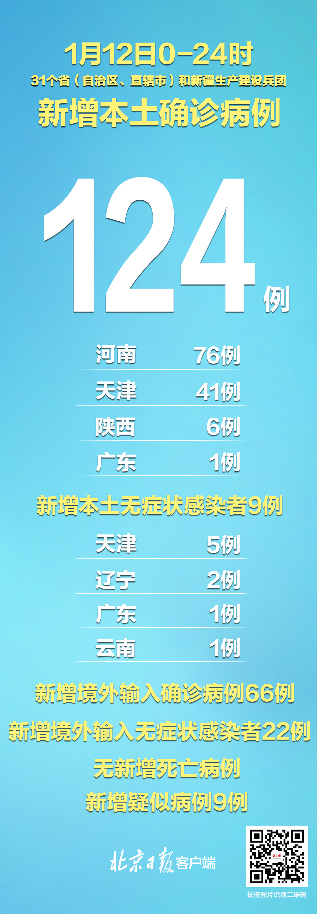 1月12日0—24时,31个省(自治区、直辖市)和新疆生产建设兵团报告新增确诊病例190例。其中境外输入病例66例(上海31例,广东17例,天津6例,福建5例,浙江4例,广西2例,北京1例),含6例由无症状感染者转为确诊病例(浙江4例,广东2例);本土病例124例(河南76例,其中安阳市43例、许昌市28例、郑州市3例、信阳市1例、滑县1例;天津41例,其中津南区40例、河西区1例;陕西6例,均在西安市;广东1例,在深圳市)。无新增死亡病例。新增疑似病例9例,均为境外输入病例(均在上海)。
