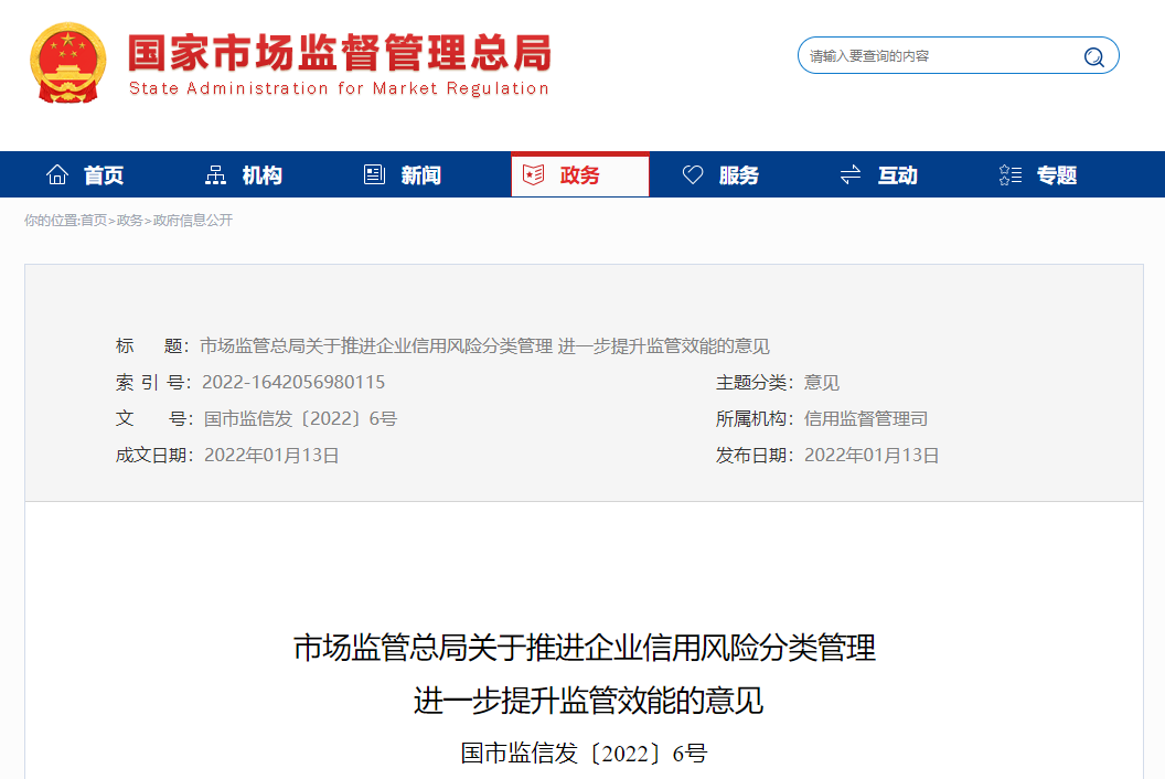 市场监管总局今天印发《关于推进企业信用风险分类管理进一步提升监管效能的意见》,在市场监管系统全面推进企业信用风险分类管理,从而进一步优化监管资源配置,提升监管效能,推动构建信用导向的营商环境,实现高质量发展。