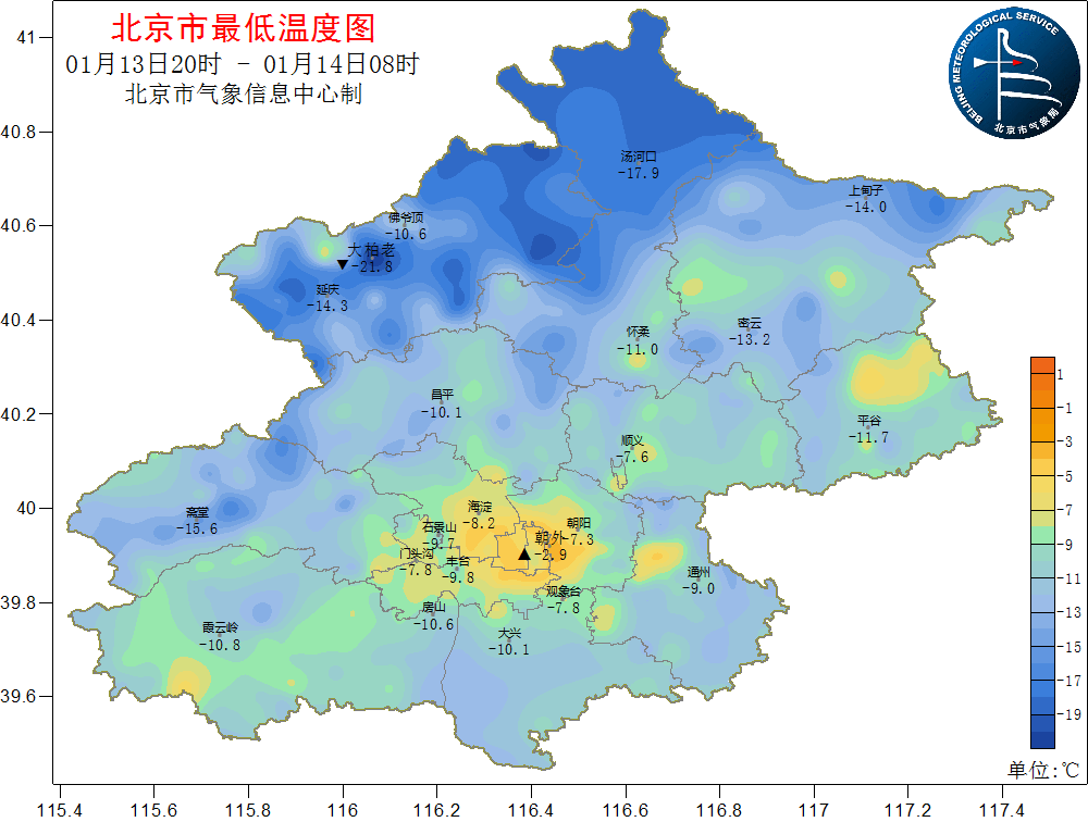 13日20时至14日08时,南郊观象台最低气温为-7.8℃。