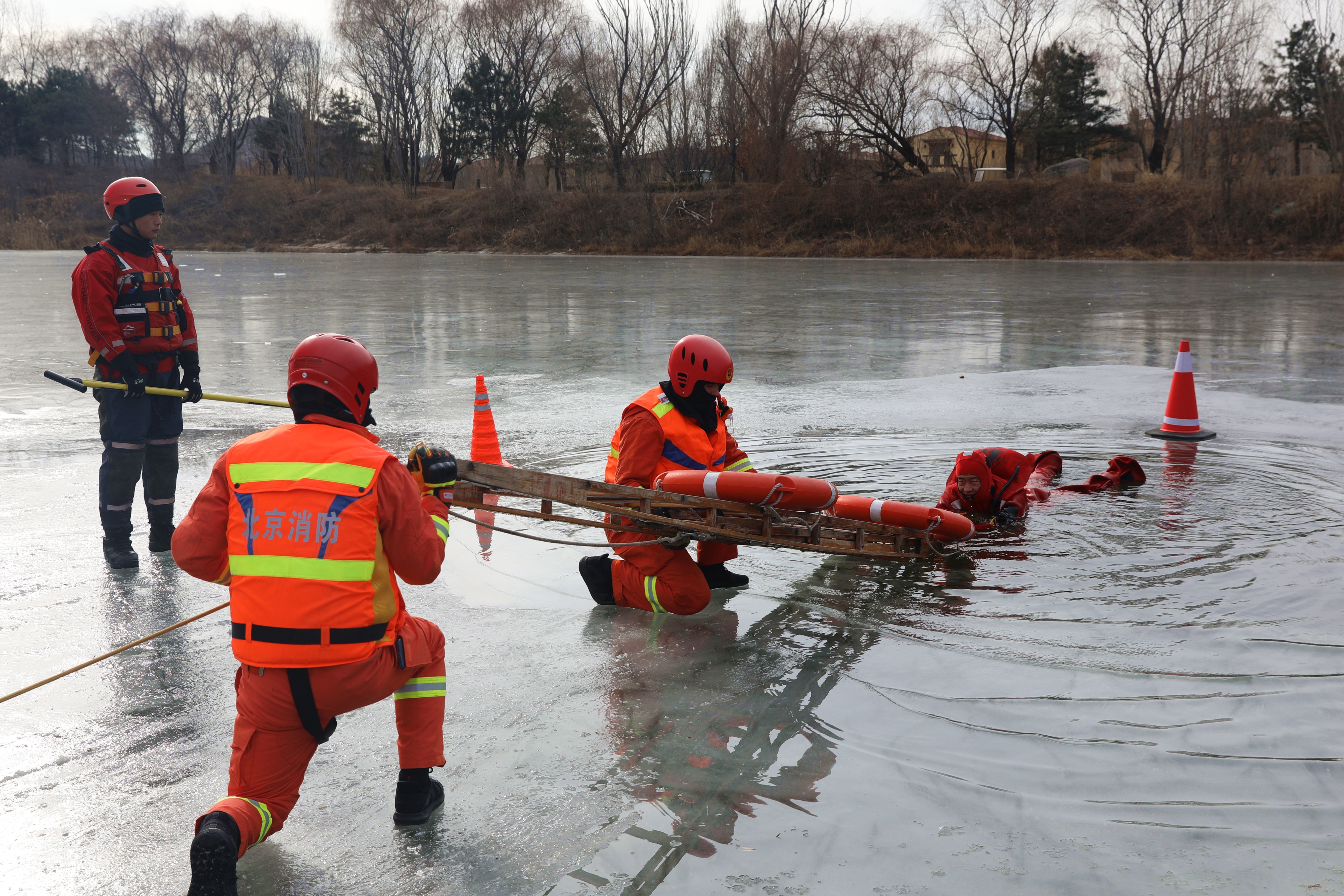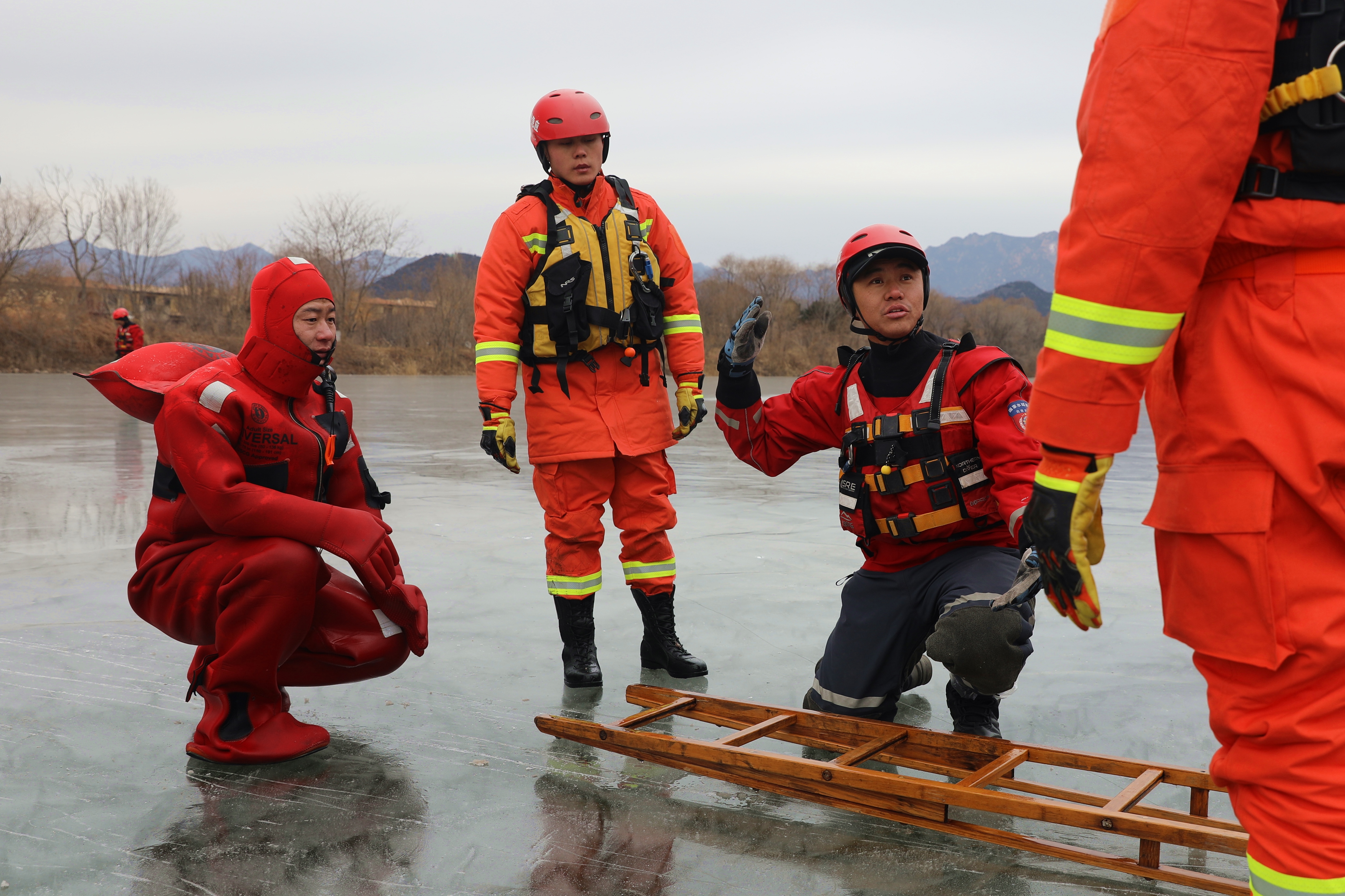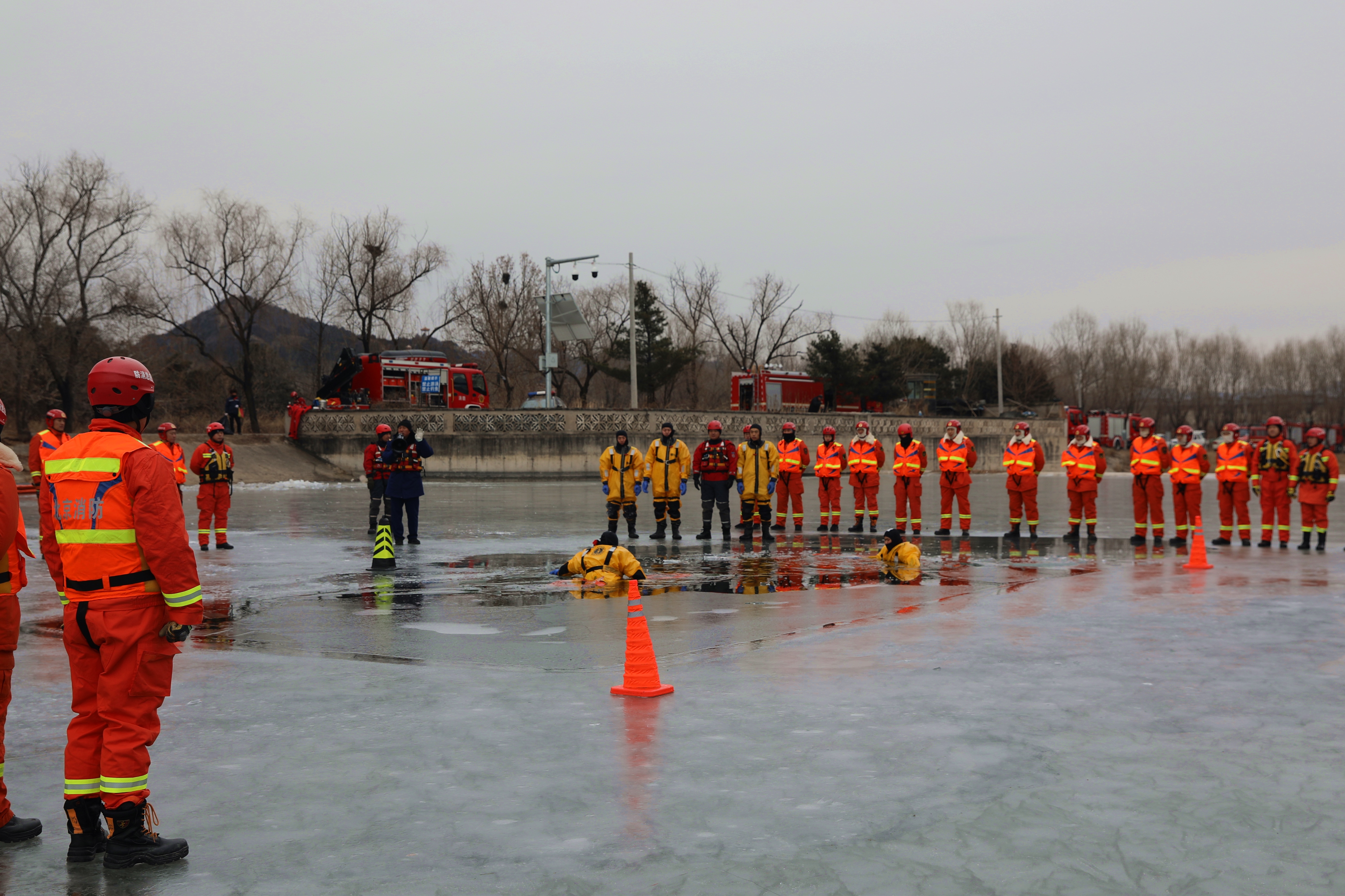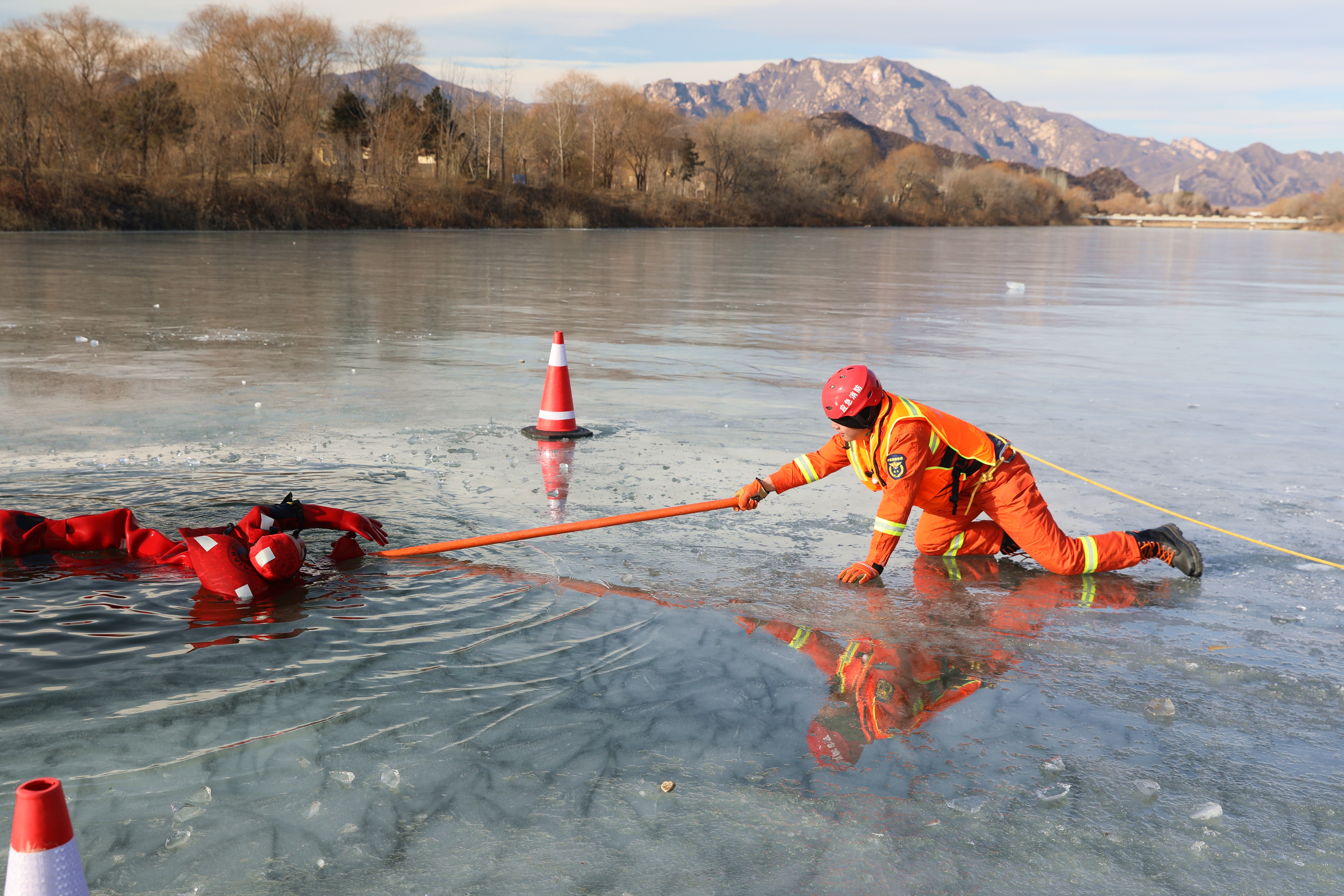 为应对冬季低温冰冻灾害,以及冰上活动引发的意外事故增多的情况,强化消防救援人员处置冰面救援的业务技能水平,1月11日至13日,北京市密云区消防救援支队组织50余名指战员在辖区一处开放水域集中开展冰面救援技能培训。