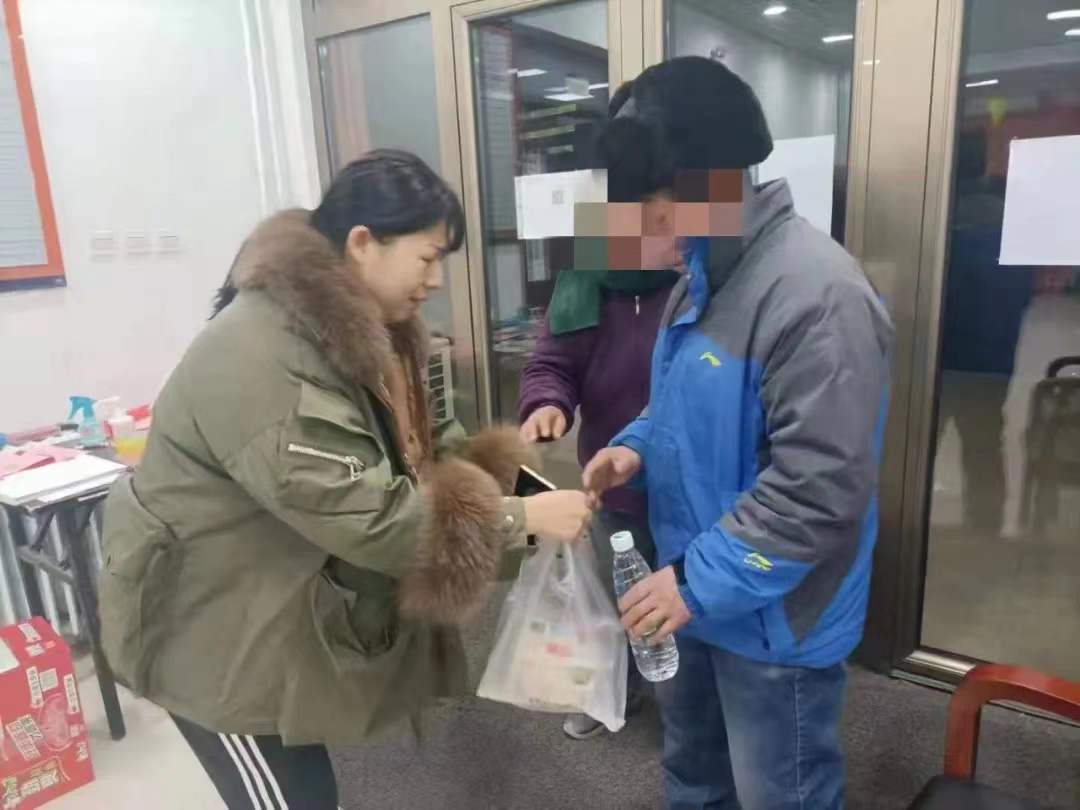 “阿姨您怎么称呼?住哪里?我们送您回家。”面对多次询问,老人仍然答非所问,始终给不出任何有效信息,并且执意要进一层住户家找人。然而,该住户也一头雾水,表示并不认识老人。于是,王月把老人搀回居委会暂作休息,见老人拿着一根杨树杈,背着个包裹,显得有些狼狈,王月不免一阵心酸,赶紧买来水和面包,看老人一边吃着喝着,他一边安抚老人的情绪。