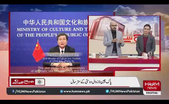 由中国文化和旅游部与中国驻巴基斯坦使馆共同组织制作的特辑节目《Subha Se Agay》,近日通过巴基斯坦新闻频道HUM最受欢迎的早间节目之一在电视上播出。