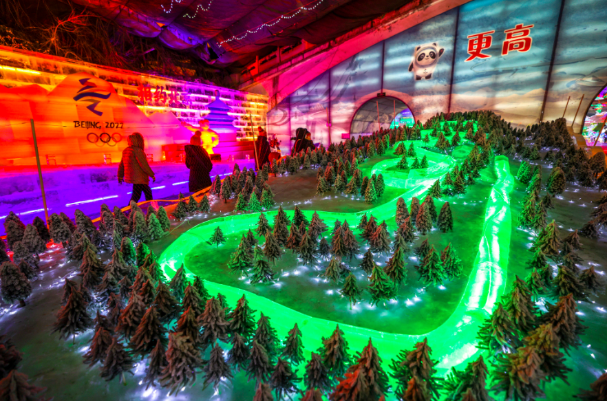 过文化广场往景区深处走,步入冰灯、冰雕集中展区,满眼都是绚烂多彩的冰灯、冰雪建筑。一条状如“游龙”的冰制建筑从高处蜿蜒而下、穿越林木,灯光点亮,“游龙”变幻色彩、栩栩如生。”这是延庆赛区的‘国家雪车雪橇中心’,我们期望通过冰制建筑的形式,让观众不到赛区也能看到场馆全貌。”龙庆峡相关负责人说。
