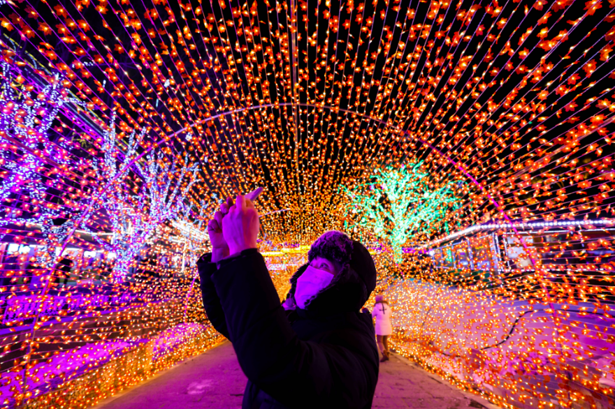 沿步道前行,花灯“龙盘柱”伴随游客一路向前,动物、花鸟鱼虫造型冰灯绚烂缤纷,蒲公英地插灯、钻石树灯和水母树灯造型各异、趣味横生,小朋友们在灯海中欢乐穿行、嬉戏。再往里走,龙庆峡文化广场一侧5000平方米的山体上,“彩龙出岫”山体激光秀正在上演中,万米长城轮廓灯勾勒出蜿蜒夺目的光彩长城,高山滑雪赛道、奥运健儿滑雪滑冰的身影等影像一一投射其上、亦静亦动,吸引观者驻足观赏、频频举起手机拍照。