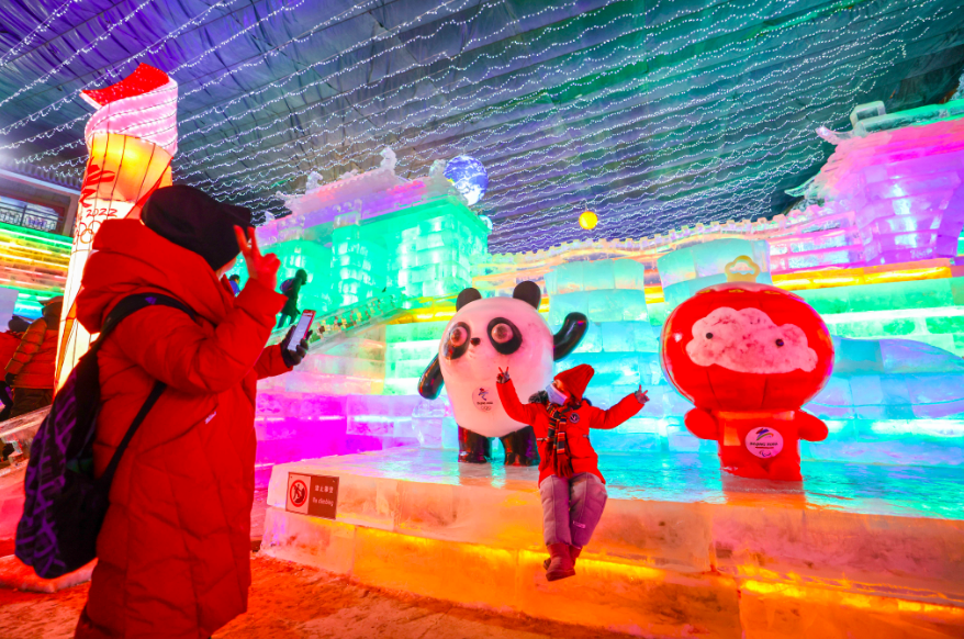 冰墩墩和雪容融冰灯吸引游客打卡留念。