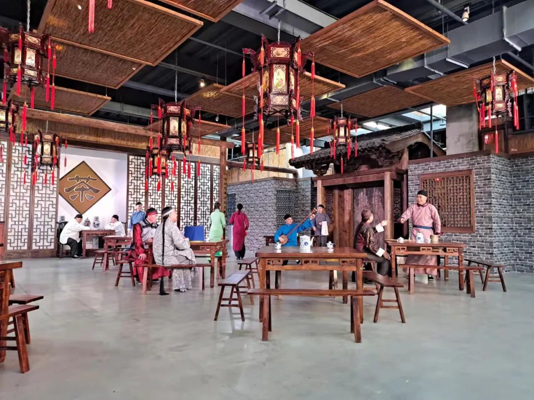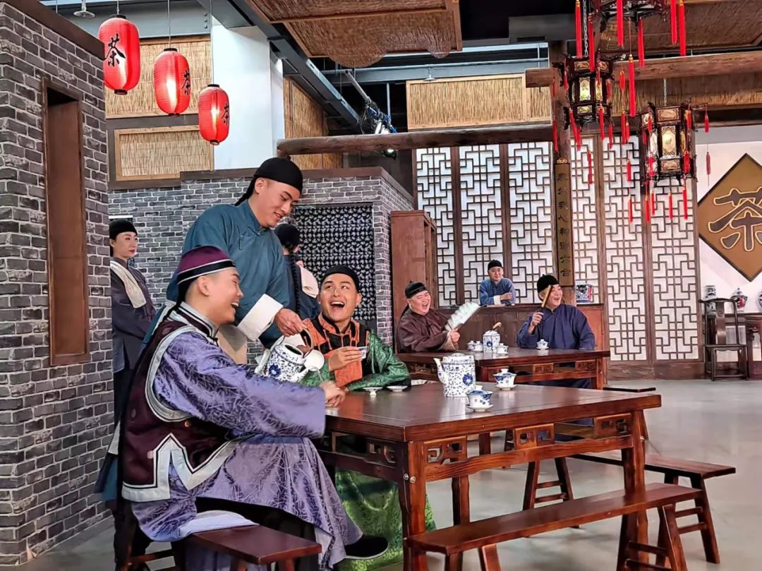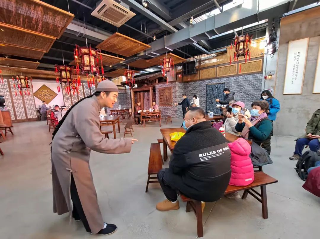 大方桌、长条凳、一壶茶……有遛完鸟前来喝茶的旗人,有清宫里的太监,还有穷困潦倒卖闺女的农民……1月12日,小编来到了台湖镇演艺车间庆礼堂茶馆剧场,由北京曲剧团带来的北京曲剧浸没式驻场演出《茶馆》正在这里上演。