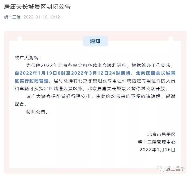 据北京市昌平区明十三陵管理中心消息,为保障2022年北京冬奥会和冬残奥会顺利进行,根据筹办工作要求,自2022年1月19日0时至2022年3月12日24时期间,北京居庸关长城景区实行封闭管理。届时除持有北京冬奥组委专用证件或指定专用证件的人员和车辆可从指定区域进入景区外,北京居庸关长城景区暂停对公众开放。请广大游客提前做好行程安排,由此给您带来的不便敬请谅解,感谢配合。