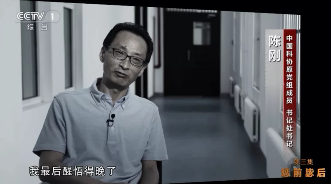 陈刚(中国科协原党组成员 书记处书记):我感恩党的审查和法律的制裁,这些都对你是一种救赎,是一种拯救。因为在这个时候,你去掉了这些污泥浊水之后,才可能有一个干净的灵魂,过一种新的生活。把过去那些彷徨、惶惶不可终日,那种纠结的人生状态扔掉了,我现在的精神状态跟过去相比,我认为要健康得多。