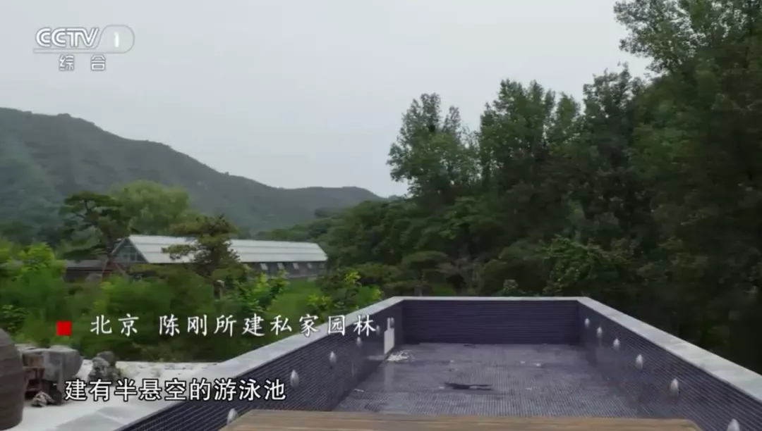 【解说词】该园林总占地面积109亩,建筑面积3000多平方米,装饰奢华,内有中式四合院、西式临水全玻璃别墅、日式庭院等,建有半悬空的游泳池、人造白沙滩、影音室、按摩房等场所。建成之后,陈刚经常带家人亲友和商人老板来这里休闲娱乐,沉醉于自己打造的“品质生活”空间。现在回头,他才感到私欲的狭隘。