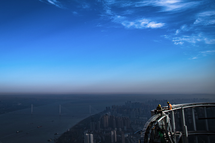 中建三局二公司工人在武汉绿地中心项目建设现场近500米的高空施工。新华社记者肖艺九 摄