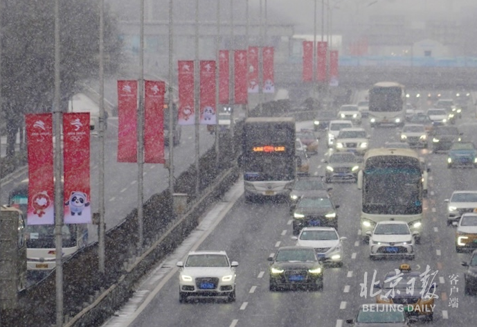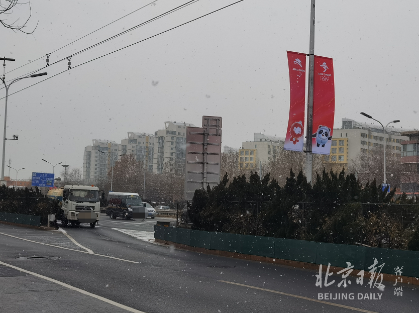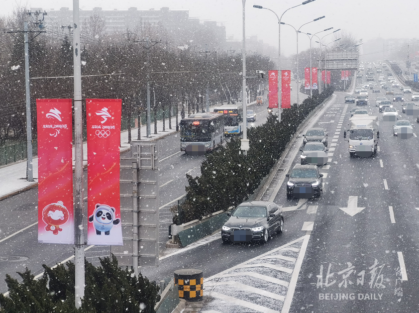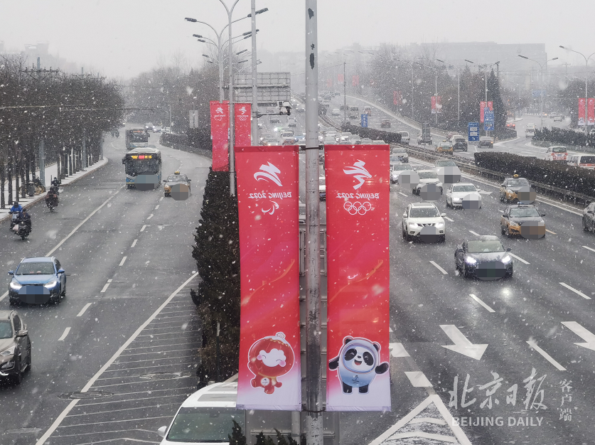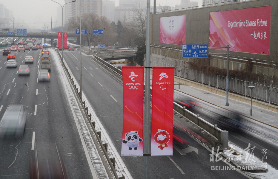 随着北京冬奥会的临近,北京阜石路、四环路等沿线悬挂上冬奥标识旗帜,烘托出浓浓的冬奥氛围。