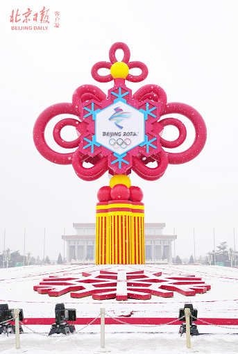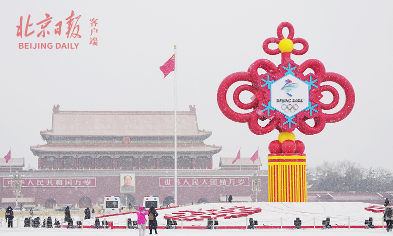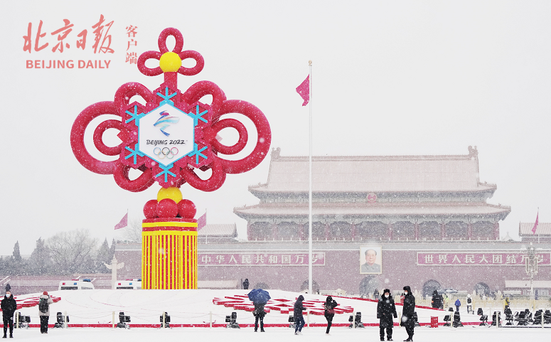 1月20日,北京城漫天飞雪迎冬奥,天安门广场冬奥主题花坛,在雪中鲜艳夺目。