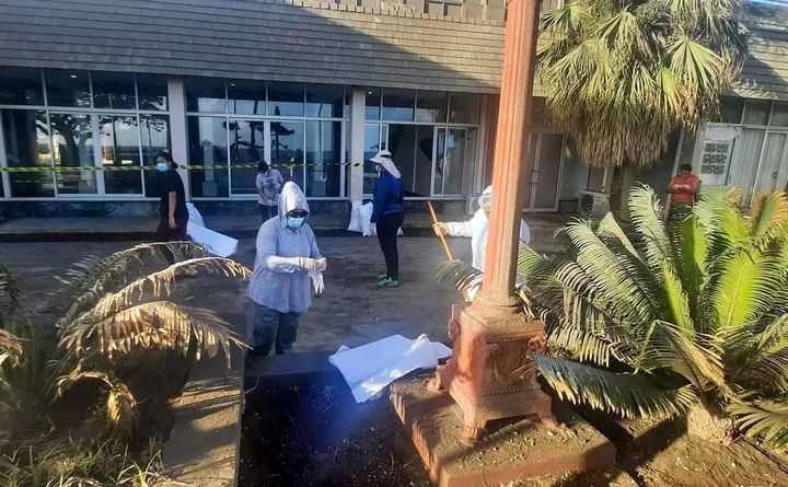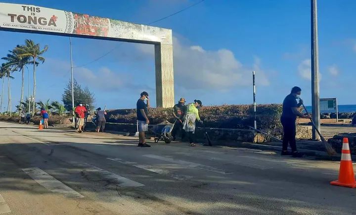 1月20日早晨,当地居民在汤加首都努库阿洛法清理路面。新华社发(马里安摄)