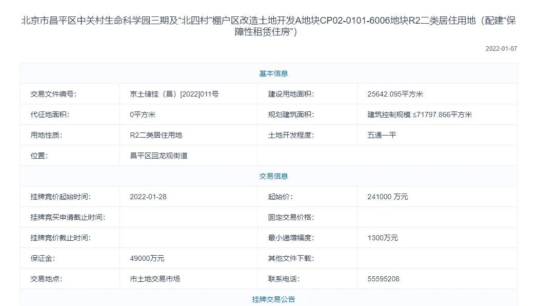 北京中关村生命科学园三期及“北四村”棚户区改造和环境整治A地块项目位于昌平区回龙观中部,项目用地北至龙城北路,南至二拨子横四路,西邻京包铁路,东至龙城花园。由未来科学城集团负责该地块入市前期的土地供应工作,目前,该地块已在北京市规划与自然资源委员会官网集中发布挂牌出让公告。