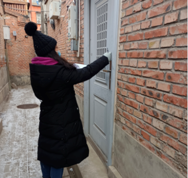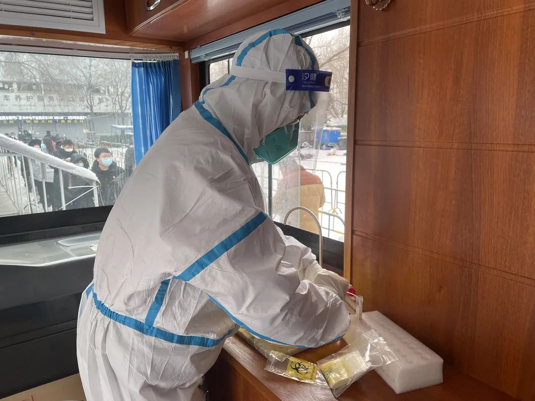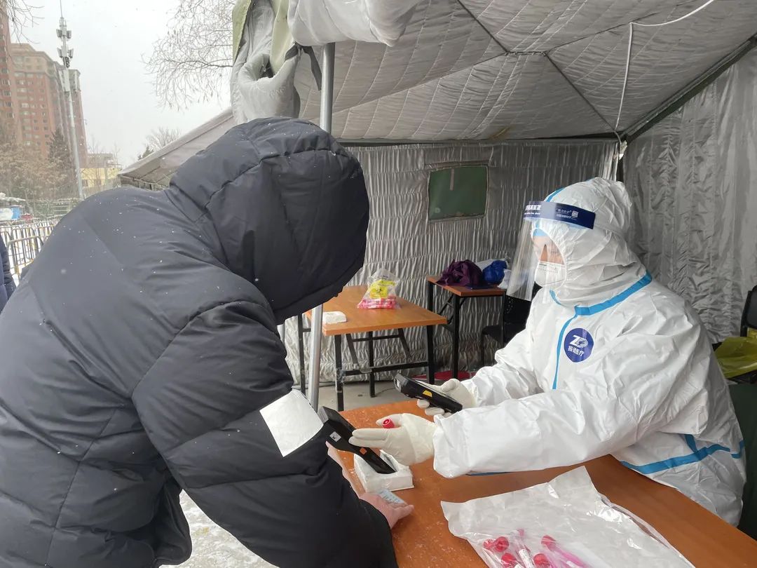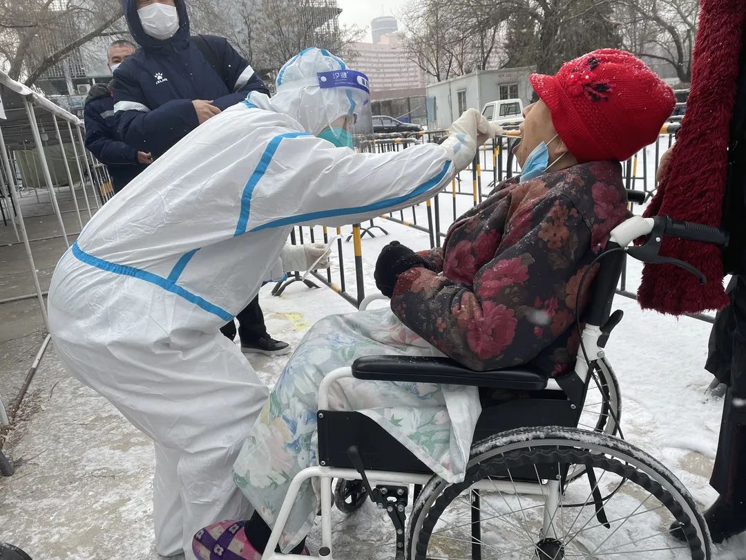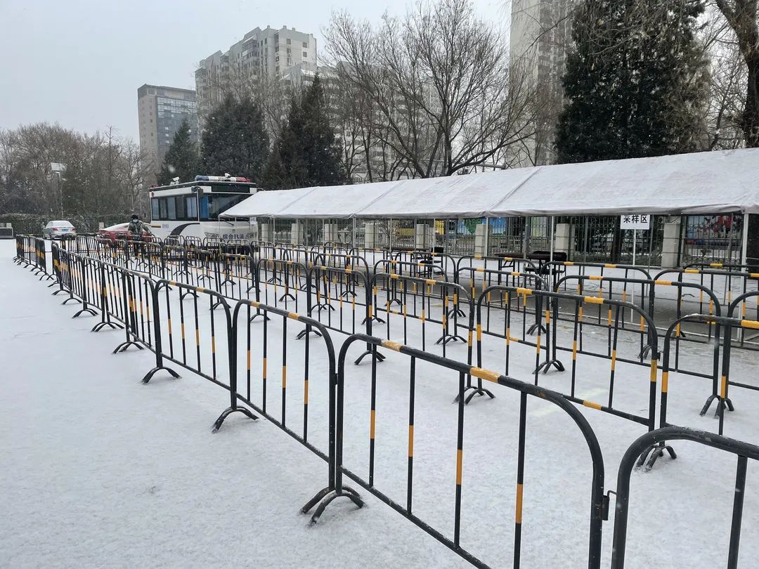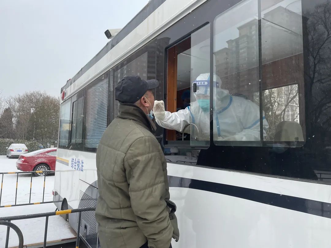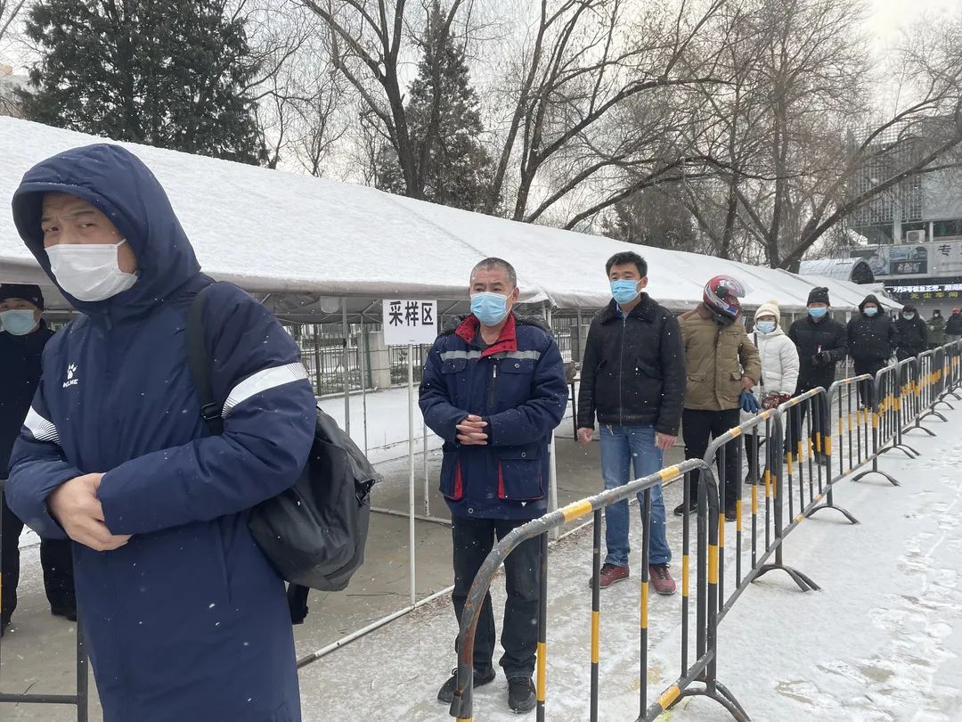 1月20日上午,北京上空飘起了雪花,气温较低,体感较冷。方庄街道组织辖区内装卸搬运工、装修运输工和平房区人员开展核酸检测。芳群园三区和芳城东里社区工作人员一早就拿着人员联络表、挨家挨户敲门告知平房区的居民,做好防护,按照要求,及时前往核酸检测点参加检测。