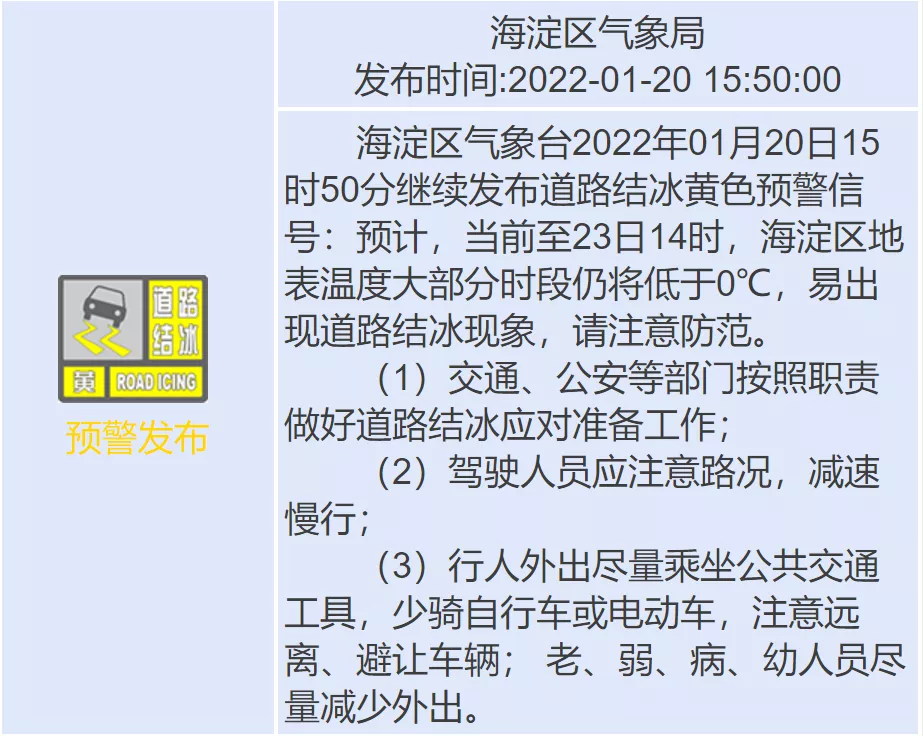 海淀区气象台2022年01月20日15时50分继续发布道路结冰黄色预警信号:预计,当前至23日14时,海淀区地表温度大部分时段仍将低于0℃,易出现道路结冰现象,请注意防范。