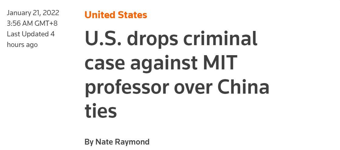 据路透社最新消息,美国司法部当地时间1月20日正式撤销对麻省理工学院华裔教授陈刚的指控。此前,美司法部曾指控该教授在寻求联邦拨款时隐瞒与中国的关系,中国外交部就有关事件敦促美方停止编造借口,对中国抹黑打压,停止干扰破坏中美在科技人文领域的正常交流合作。路透社称,美司法部这一最新举动是美国所谓“中国行动计划”遇到的最新挫折。