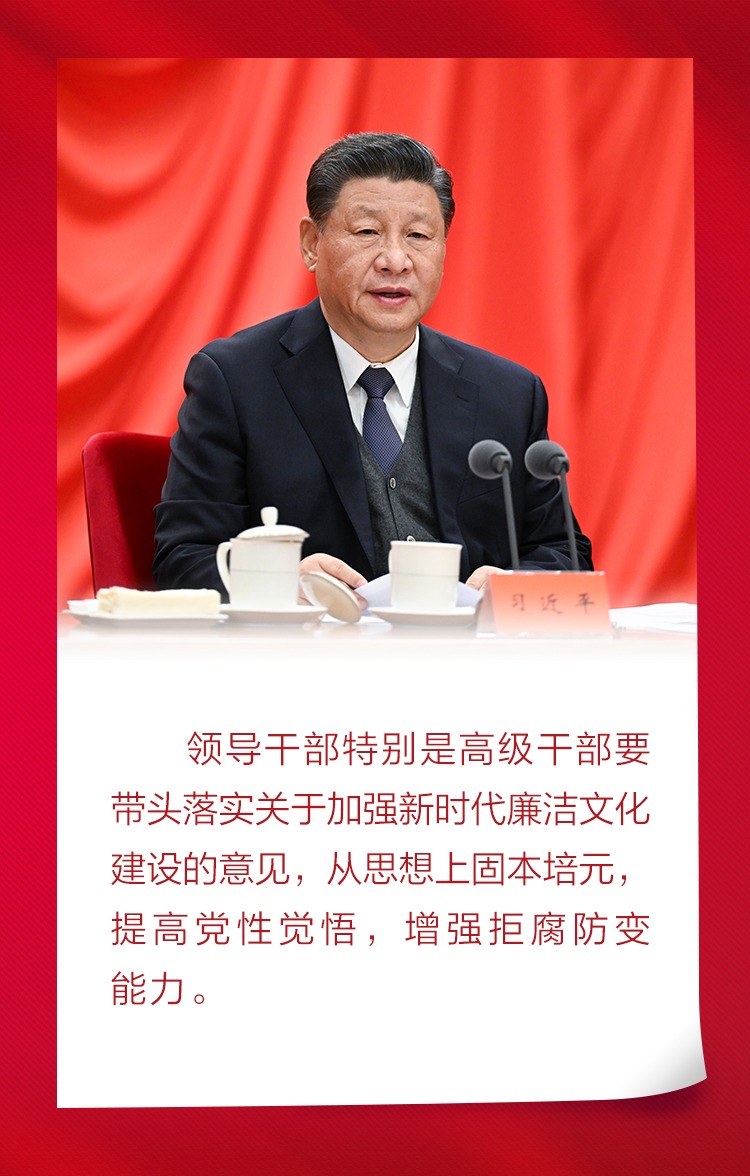 谈及保持反腐败政治定力,不断实现不敢腐、不能腐、不想腐这一战略目标时,总书记叮嘱:“领导干部特别是高级干部要带头落实关于加强新时代廉洁文化建设的意见,从思想上固本培元,提高党性觉悟,增强拒腐防变能力。”