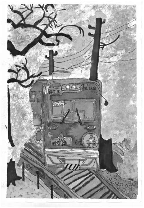 王亮女儿王之月酷爱画画,王亮也鼓励她把文学作品画下来。之月画的这幅《美丽,并不孤独的火车》,灵感源自和爸爸共读的土耳其诗人塔朗吉的诗歌《火车》。
