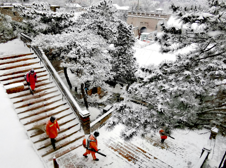 早上七点半,雪还在簌簌落下,景区已清理出安全通道,为游客提供安全游览环境。大雪不间断地落下,环卫工人们不停歇,一旦地面积雪达到一定厚度马上清扫,实现雪中路通、雪后路净。