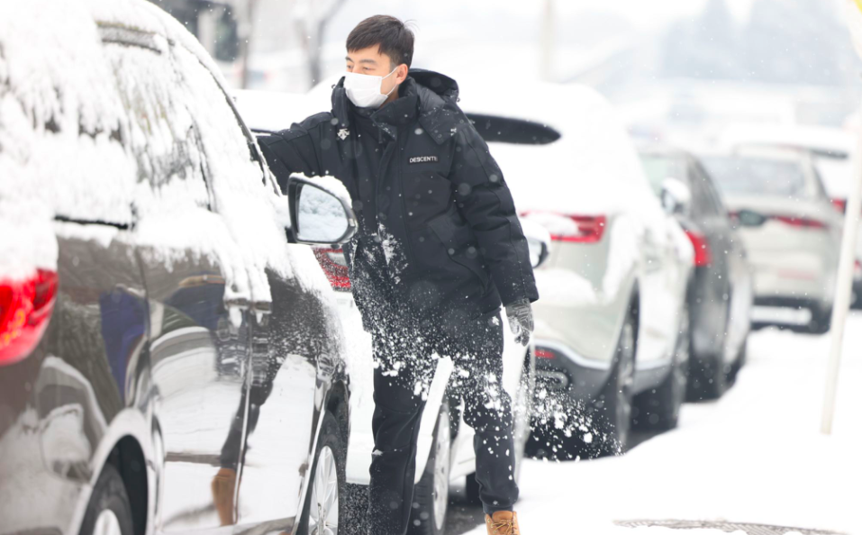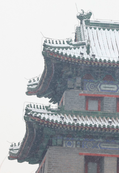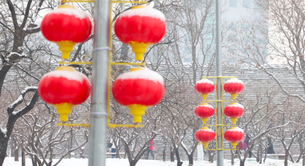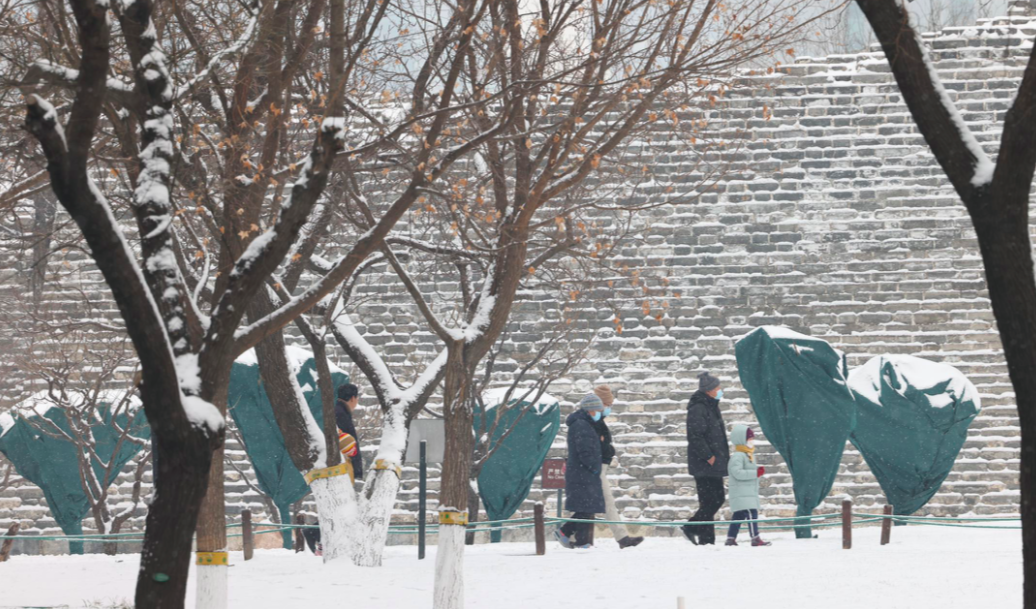 1月22日星期六,朵朵白雪洒落京城,在明城墙遗址公园附近市民严密防护下赏雪,飞雪落在串串红灯笼上,形成“雪打灯”景致,迎接北京冬奥会和传统春节的到来。