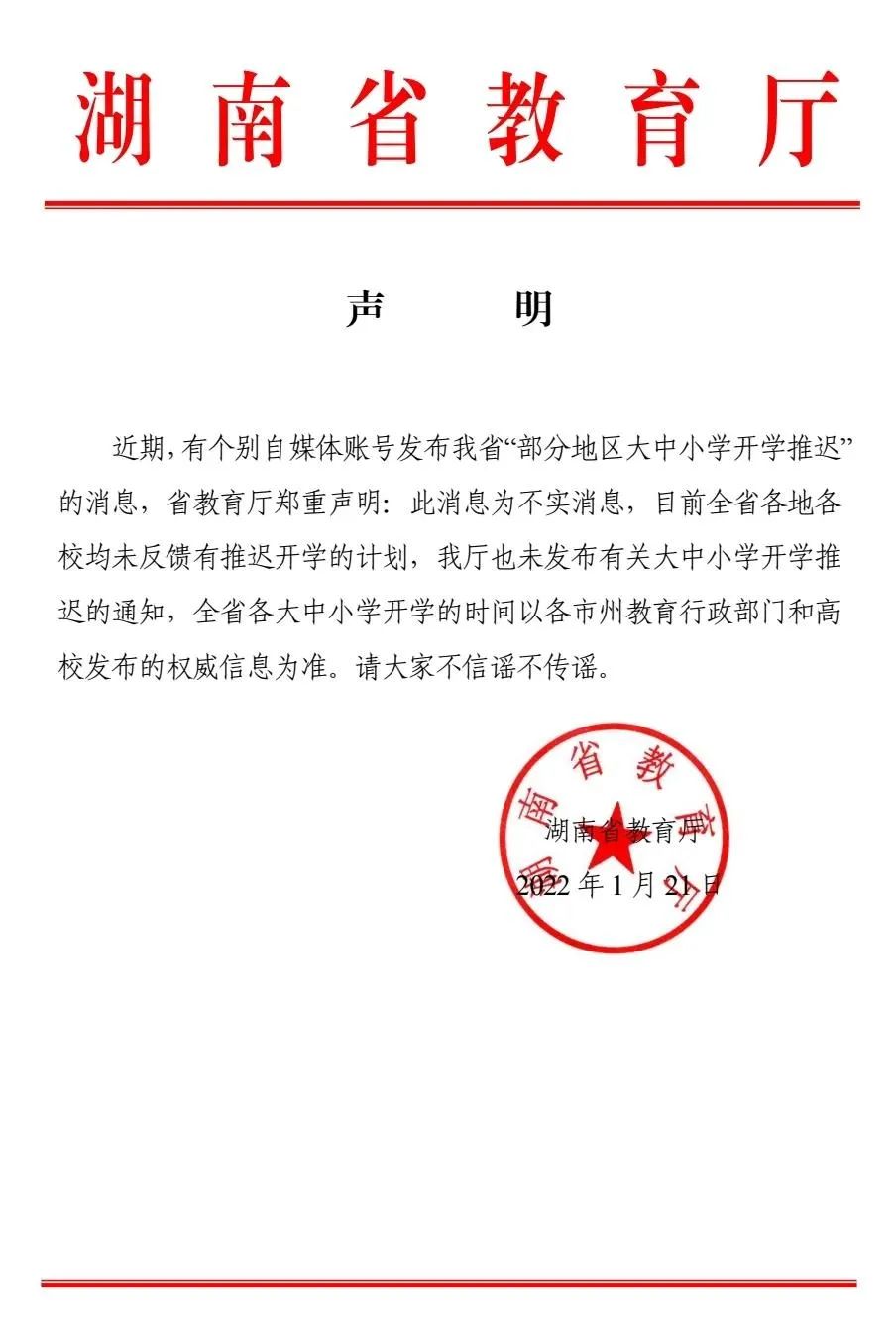针对“部分大中小学开学推迟”消息,湖南教育厅声明:不实!