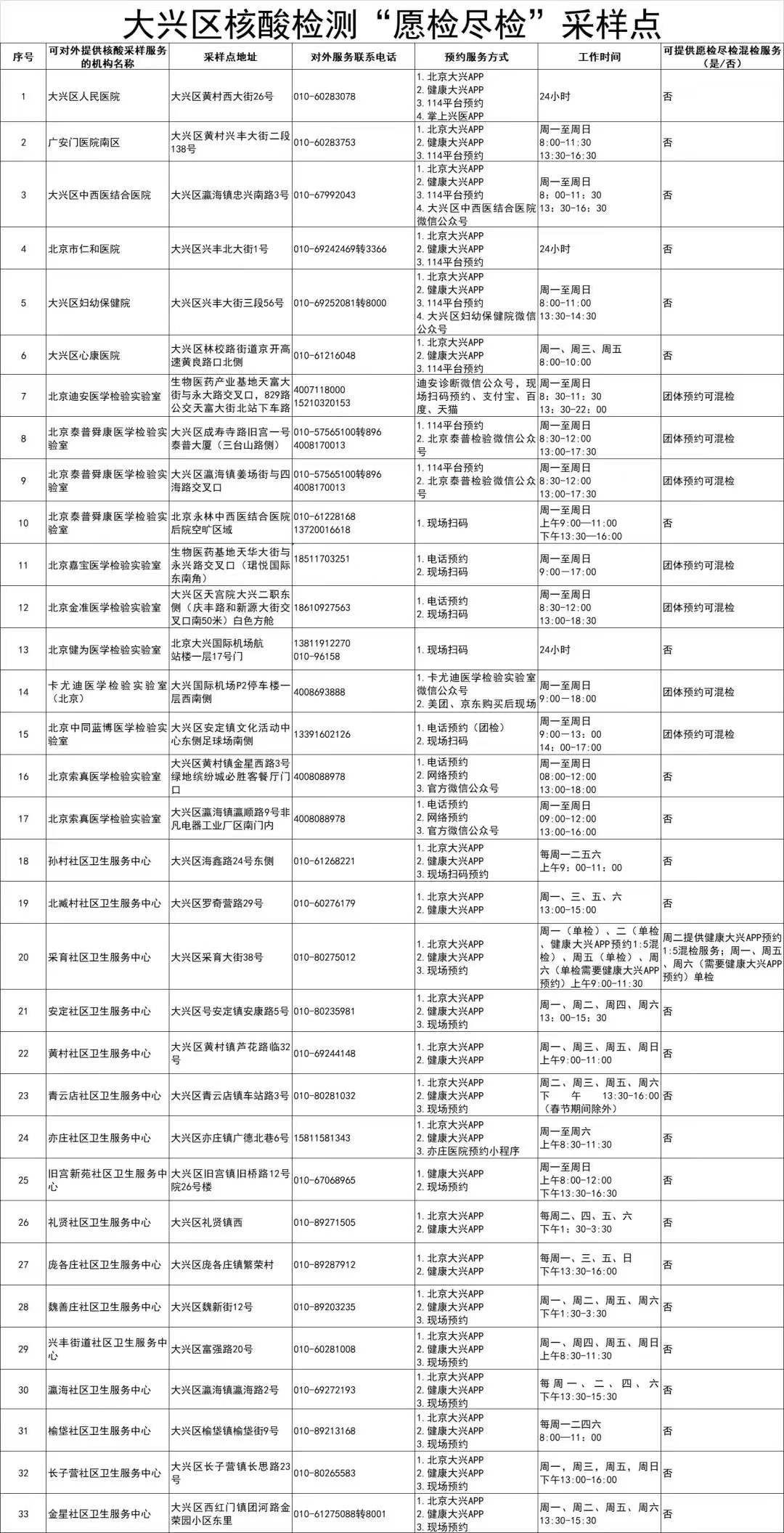 40余个核酸采样点的名称、地址、联系电话、预约方式、工作时间已由大兴区卫健委在“这里是大兴”微信公众号上公示。市民可根据目录就近选择采样点。大兴区卫健委将根据实际情况对核酸采样点位和服务时间进行动态调整,有需求的居民请密切关注相关点位的最新动向。