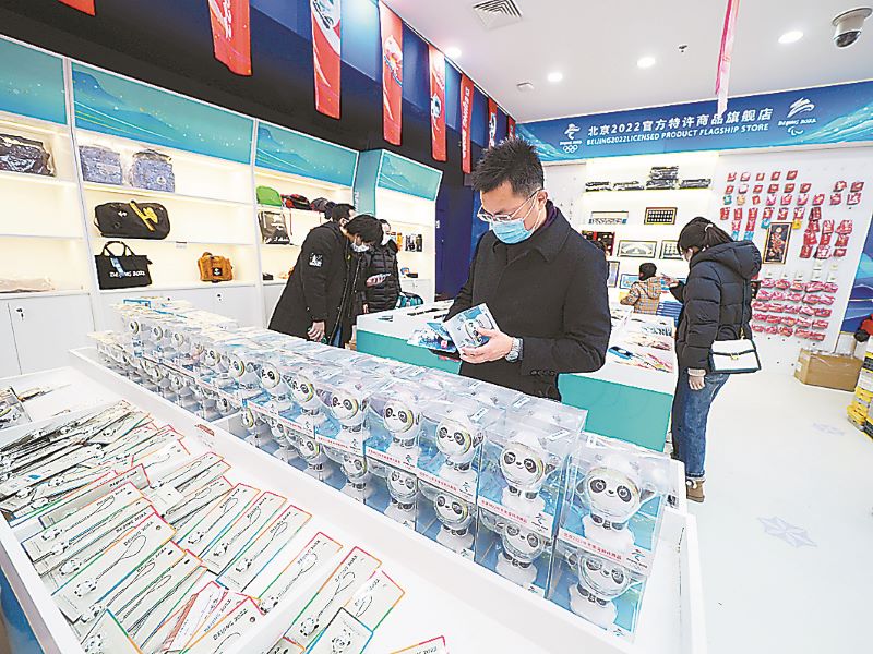 市民在北京工美大厦一层的北京2022官方特许商品旗舰店内选购冬奥纪念品。