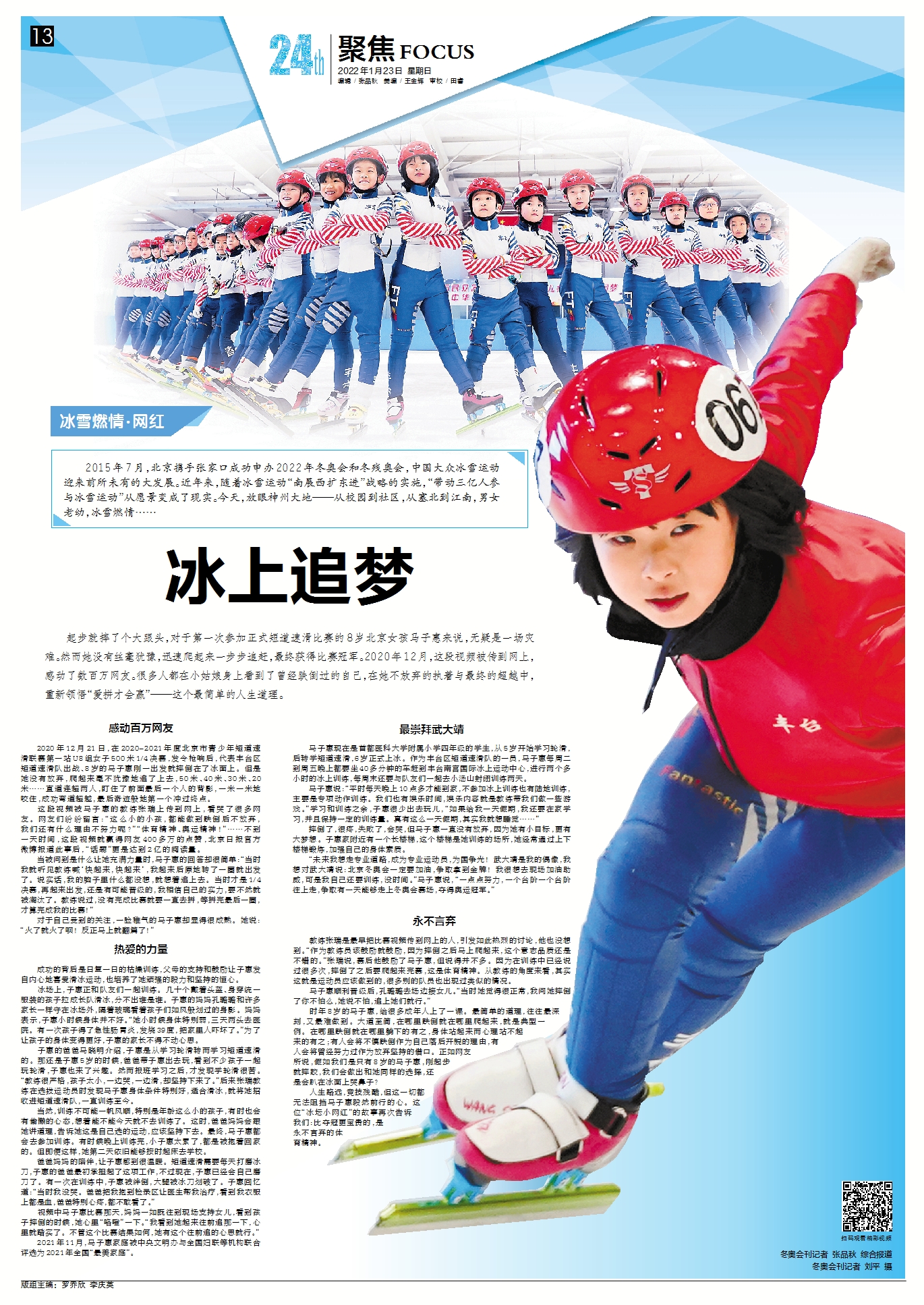 “未来我想走专业道路,成为专业运动员,为国争光!武大靖是我的偶像,我想对武大靖说:北京冬奥会一定要加油,争取拿到金牌!我很想去现场加油助威,可是我自己还要训练,没时间。”马子惠说,“一点点努力,一个台阶一个台阶往上走,争取有一天能够走上冬奥会赛场,夺得奥运冠军。”