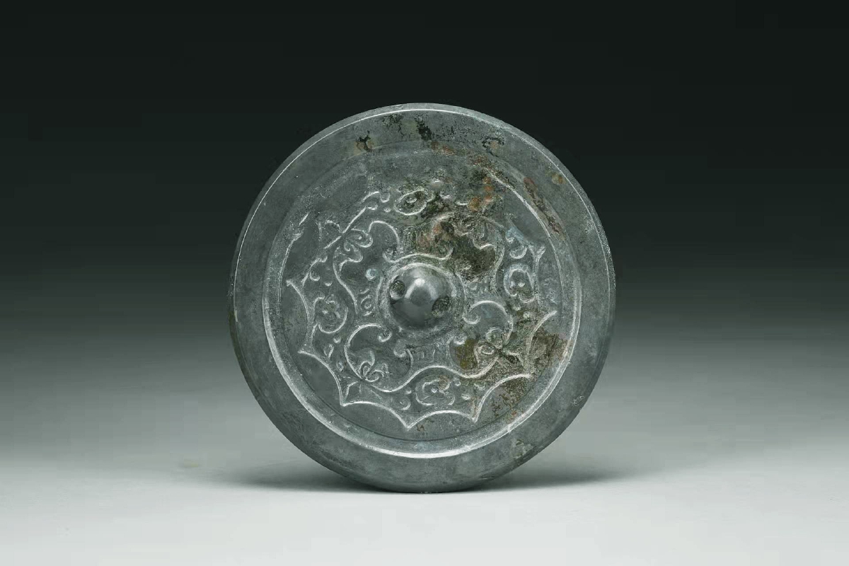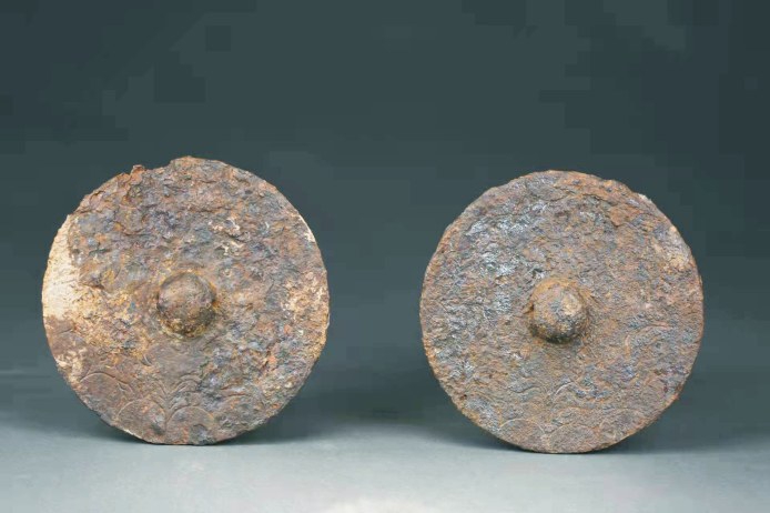 铁镜2件,形制相同。扁圆形大钮,镜缘无隆起,镜背面只可见边缘有16个内向连弧纹。直径16.3厘米。