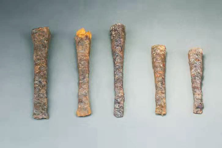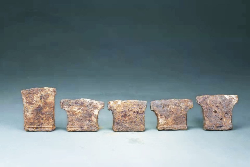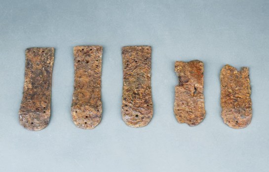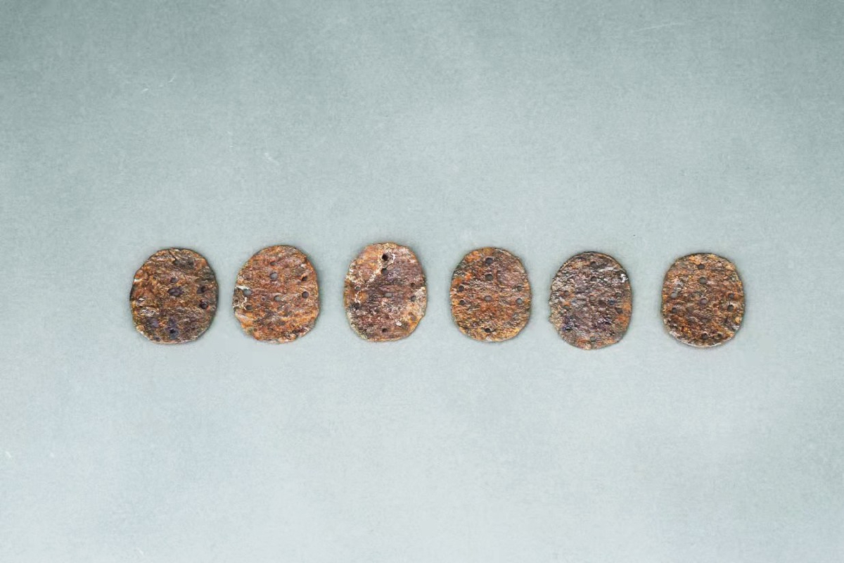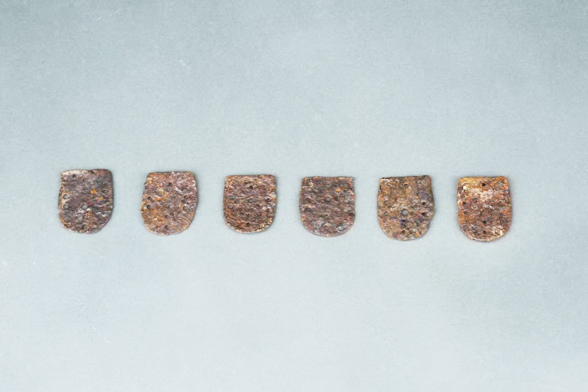 据目前统计,铁甲片有180件(包括因锈蚀严重而残断和粘连),暂定为1套。根据甲片的形制,大体可分为四型。Ⅰ型:为椭圆形,共有穿孔8个,分3列,中间4个,两侧分别有2个。长径4.1~4.2厘米、短径3.2~3.4厘米。Ⅱ型:为近似椭圆形,一侧平直,共有穿孔8个,分3列,中间4个,两侧分别有2个。长径3.9~4.0厘米、短径3.0~3.1厘米。Ⅲ型:为近似长方形,一侧为弧形,共有穿孔14个,分3列,中间4个,两侧分别有5个。长13.8~14.0厘米、宽3.7~4.1厘米。Ⅳ型:为长方形,锈蚀较严重,只可见接近边缘处有穿孔,具体数量不详。长9.5厘米、宽8.4厘米。