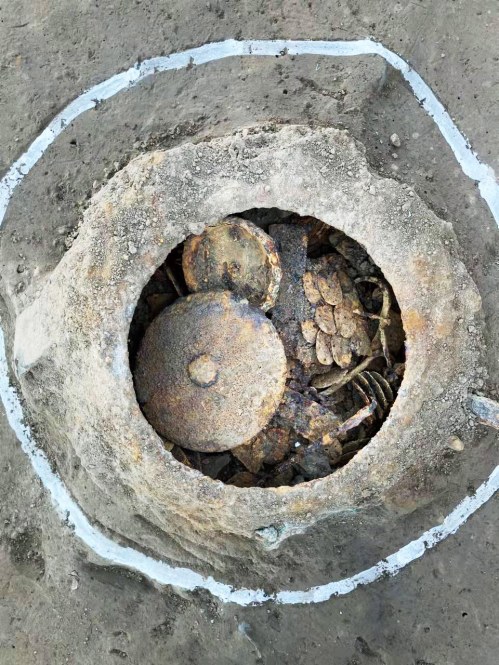 路县故城遗址位于通州区潞城镇西北部、城市副中心行政办公区北部,是一处以路县城址为核心、由城址本体(城墙、城壕及其围合区域)、城郊遗址区和城外墓葬区等构成的大遗址。路县故城作为县级治所,从西汉一直延续至隋唐之前,也就是说两汉、魏晋和北朝时期为该城址的主要使用时期。2021年9月15日至28日,北京市文物研究所在配合城市副中心行政办公区水系(镜河北段)工程建设的考古发掘中,于路县故城城址外南部清理了一处窖藏(编号2021TLGH499)。该窖藏位于路县故城的南部城郊遗址区内,北距南城墙约430米、南城壕约395米,西邻临镜路,南为兆善大街。