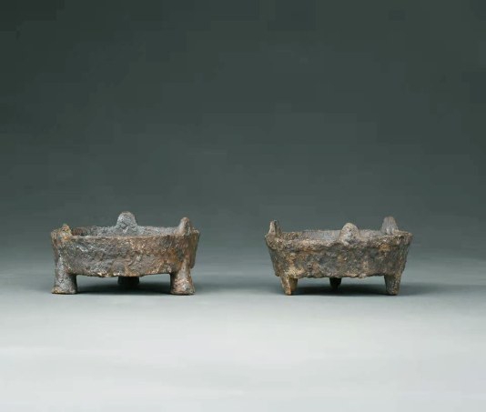 铁烛台2件,圆形盘状,平底,内底中间有尖状凸起的烛插,外底附三个柱状矮足,口沿上有三个与三足相对应的穿孔短耳。口径11厘米、底径9.3厘米、通高4.3厘米。
