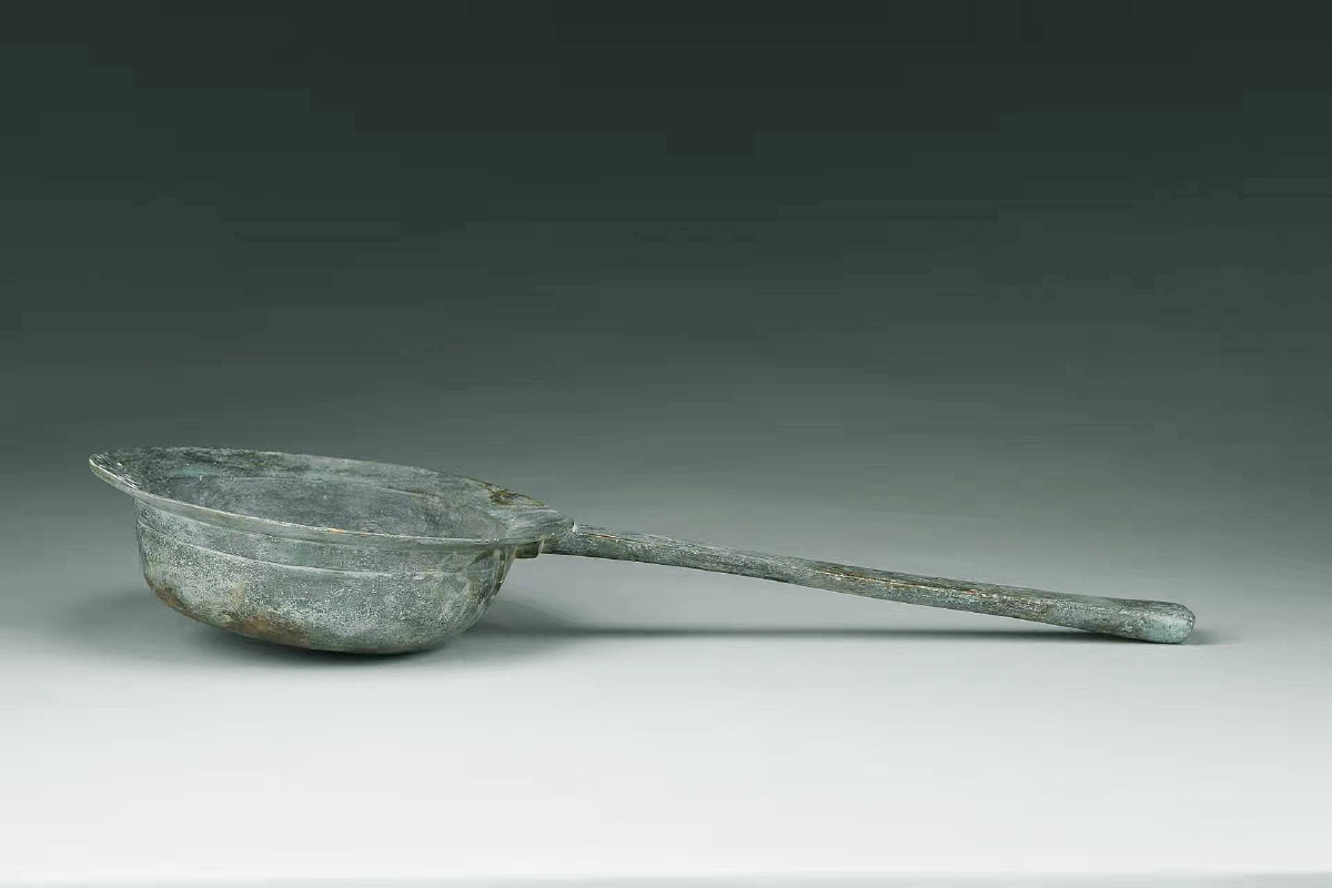 铜熨斗1件,敞口,斜折沿,弧腹向下略收,圜底。长直柄,柄前端略宽,柄的横截面呈梯形。腹上部有一周凹弦纹。与柄相对一侧的口沿部有用铆钉修补的遗存。通长36.8厘米。