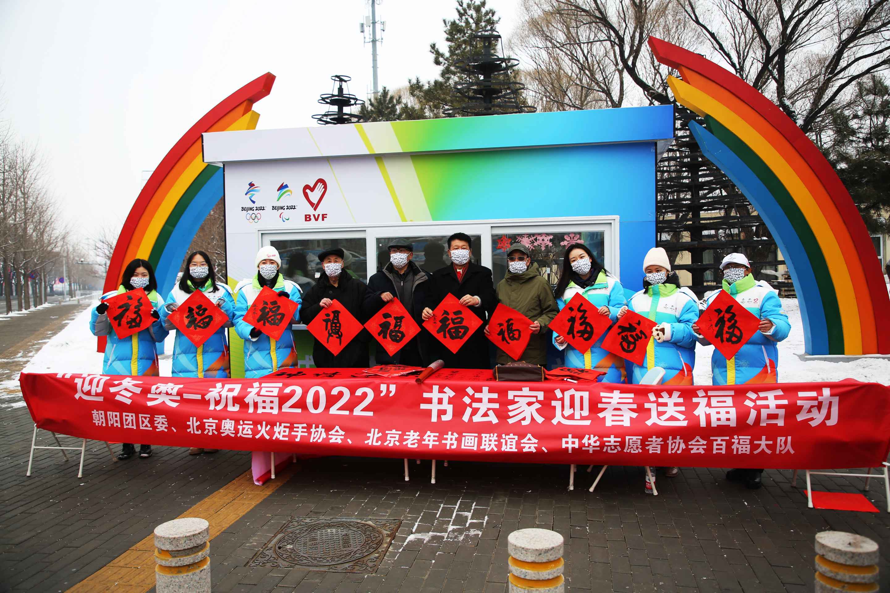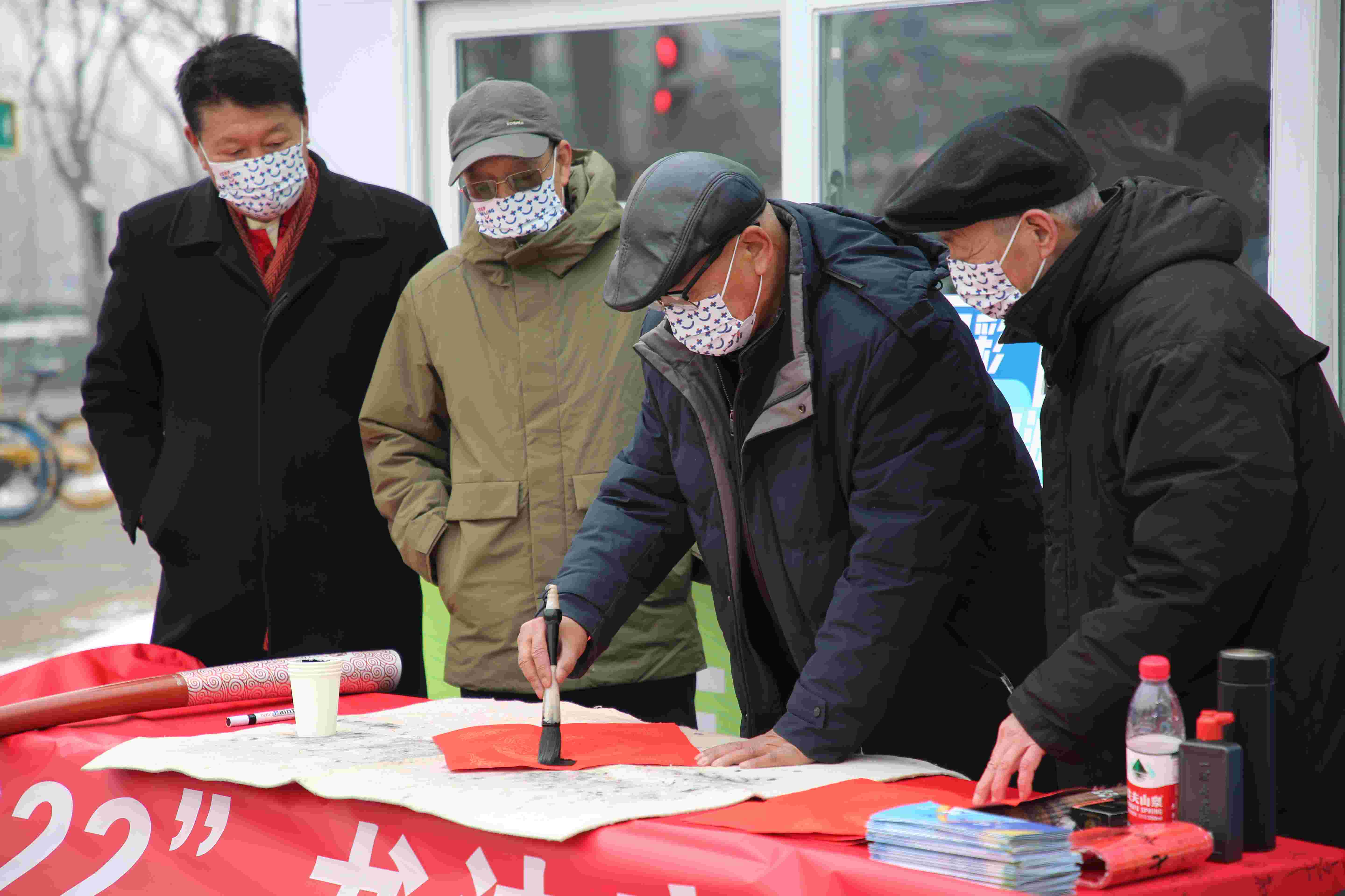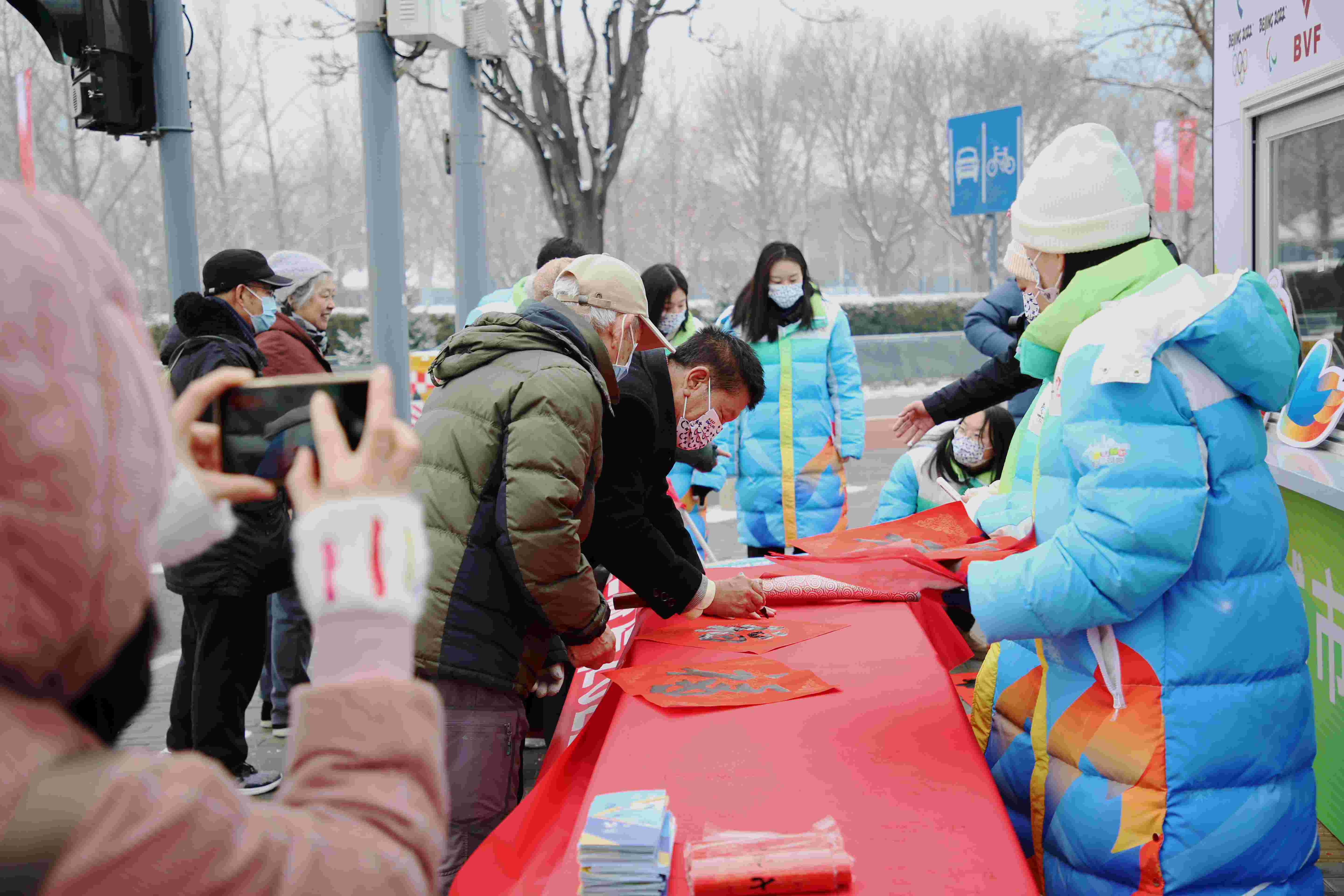 来自北京奥运火炬手协会的姚景林、高路和来自北京老年书画联谊会的罗慧文、刘书元、刘京生等书法家陆续到场,他们挥笔写下福字和对冬奥会的祝福语。姚景林还为志愿者送上了“为志愿者讴歌”的书法作品。路过的行人看到此景,走到岗亭签名并写下对冬奥会的祝福,志愿者们热情地为行人发放福字和春联。