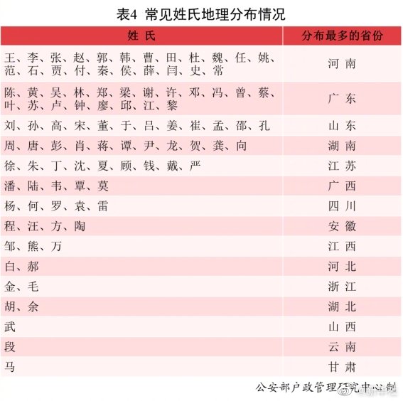 公安部户政管理研究中心24日发布2021年全国姓名报告。根据报告,姓氏在我国有着明显的地域分布特征。王、李、张等二十二个姓氏人口分布最多的省份是河南;陈、黄、吴等二十个姓氏人口分布最多的省份是广东;刘、孙、高等十二个姓氏人口分布最多的省份是山东;邹、熊、万三个姓氏人口分布最多的省份是江西。