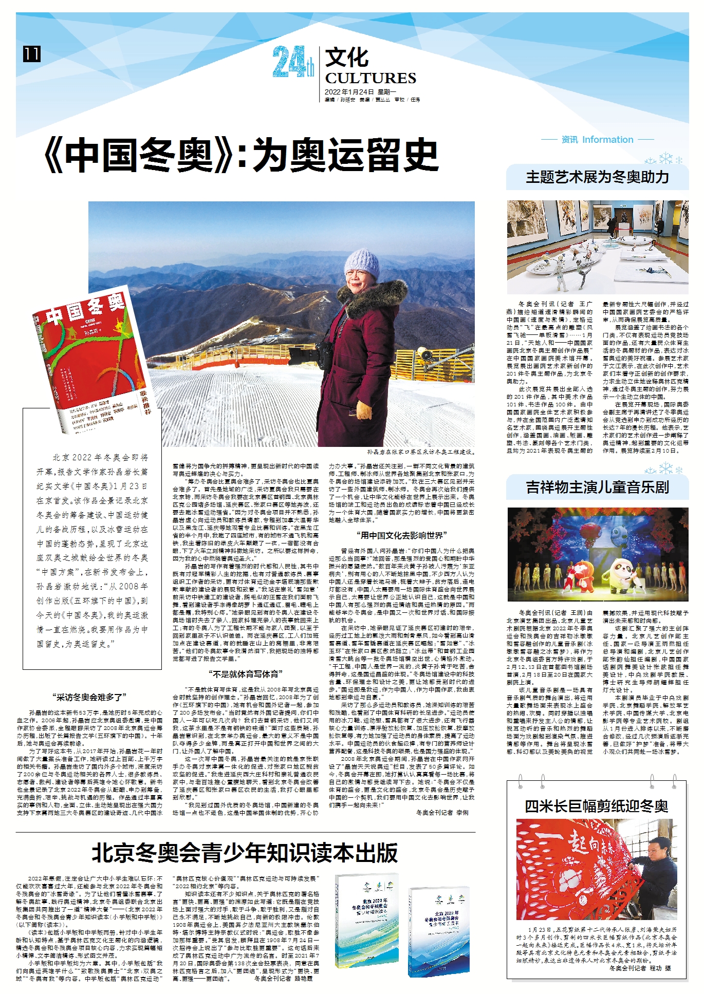北京2022年冬奥会即将开幕,报告文学作家孙晶岩长篇纪实文学《中国冬奥》1月23日在京首发。该作品全景记录北京冬奥会的筹备建设、中国运动健儿的备战历程,以及冰雪运动在中国的蓬勃态势,呈现了北京这座双奥之城献给全世界的冬奥“中国方案”,在新书发布会上,孙晶岩激动地说:“从2008年创作出版《五环旗下的中国》,到今天的《中国冬奥》,我的奥运激情一直在燃烧。我要用作品为中国留史,为奥运留史。”