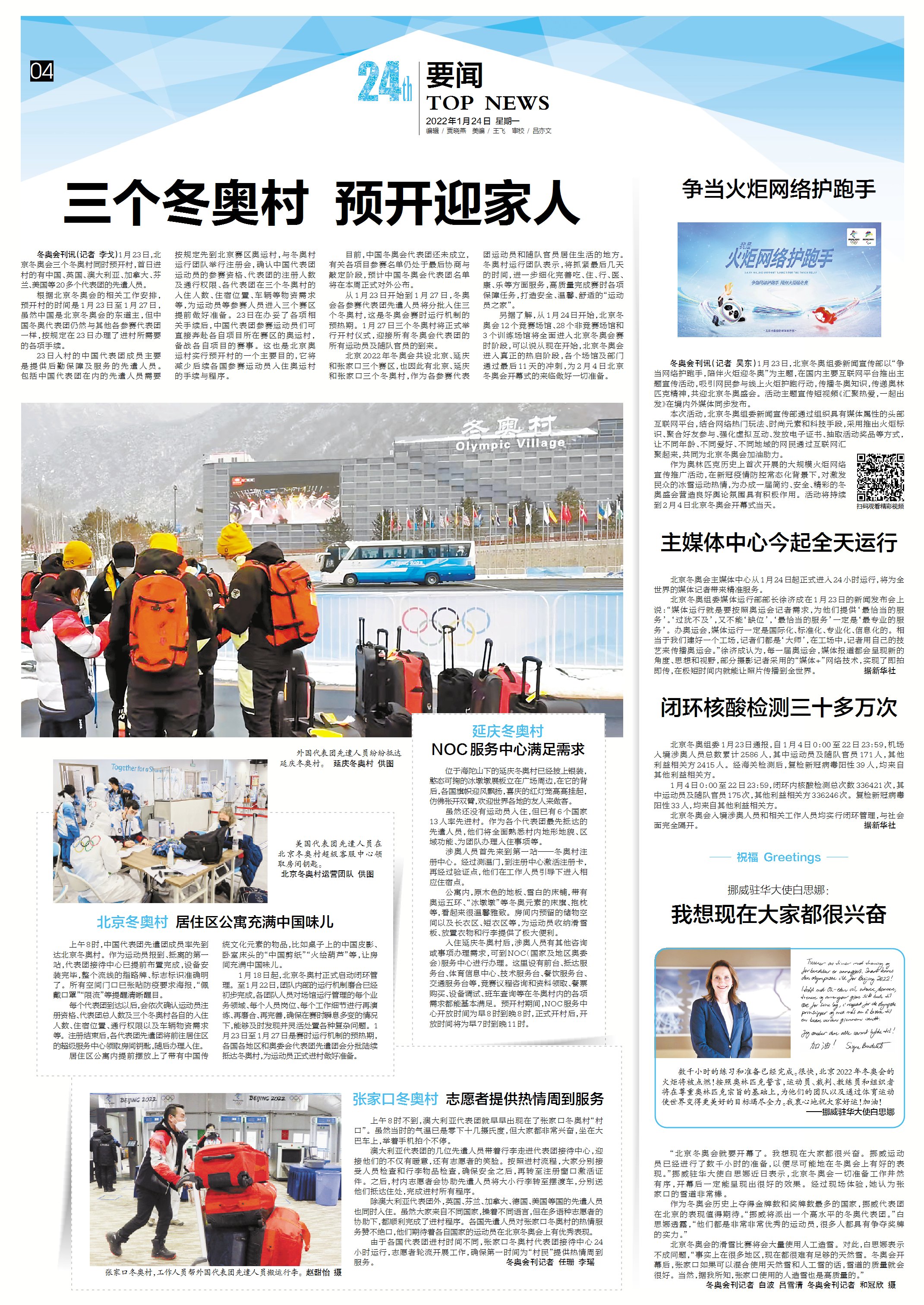北京2022年冬奥会共设北京、延庆和张家口三个赛区,也因此有北京、延庆和张家口三个冬奥村,作为各参赛代表团运动员和随队官员居住生活的地方。冬奥村运行团队表示,将抓紧最后几天的时间,进一步细化完善吃、住、行、医、康、乐等方面服务,高质量完成赛时各项保障任务,打造安全、温馨、舒适的“运动员之家”。