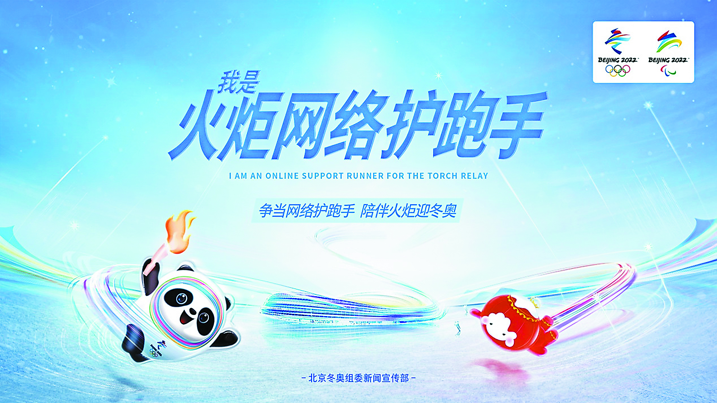 1月23日,北京冬奥组委新闻宣传部以“争当网络护跑手,陪伴火炬迎冬奥”为主题,在国内主要互联网平台推出主题宣传活动,吸引网民参与线上火炬护跑行动,传播冬奥知识,传递奥林匹克精神,共迎北京冬奥盛会。活动主题宣传短视频《汇聚热爱,一起出发》在境内外媒体同步发布。