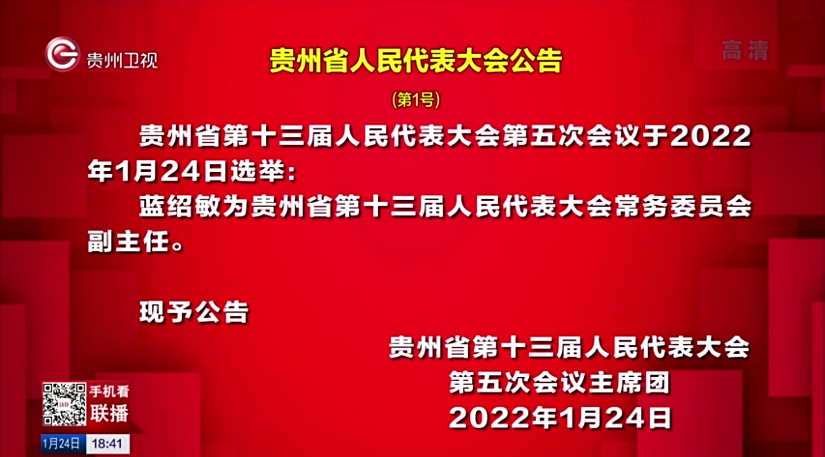 据《贵州新闻联播》报道,贵州省第十三届人民代表大会第五次会议于1月24日选举选蓝绍敏为贵州省第十三届人民代表大会常务委员会副主任。