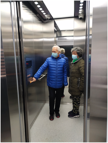 在一期加装电梯的基础上,二三期加装电梯不仅工程速度更快,项目还做了不少优化。比如根据居民建议,调整电梯内扶手的位置,更方便乘梯者抓握;在轿厢中增加监控摄像头、紫外线轿厢消毒设备;采用自动识别电动车技术,禁止电动车上楼。