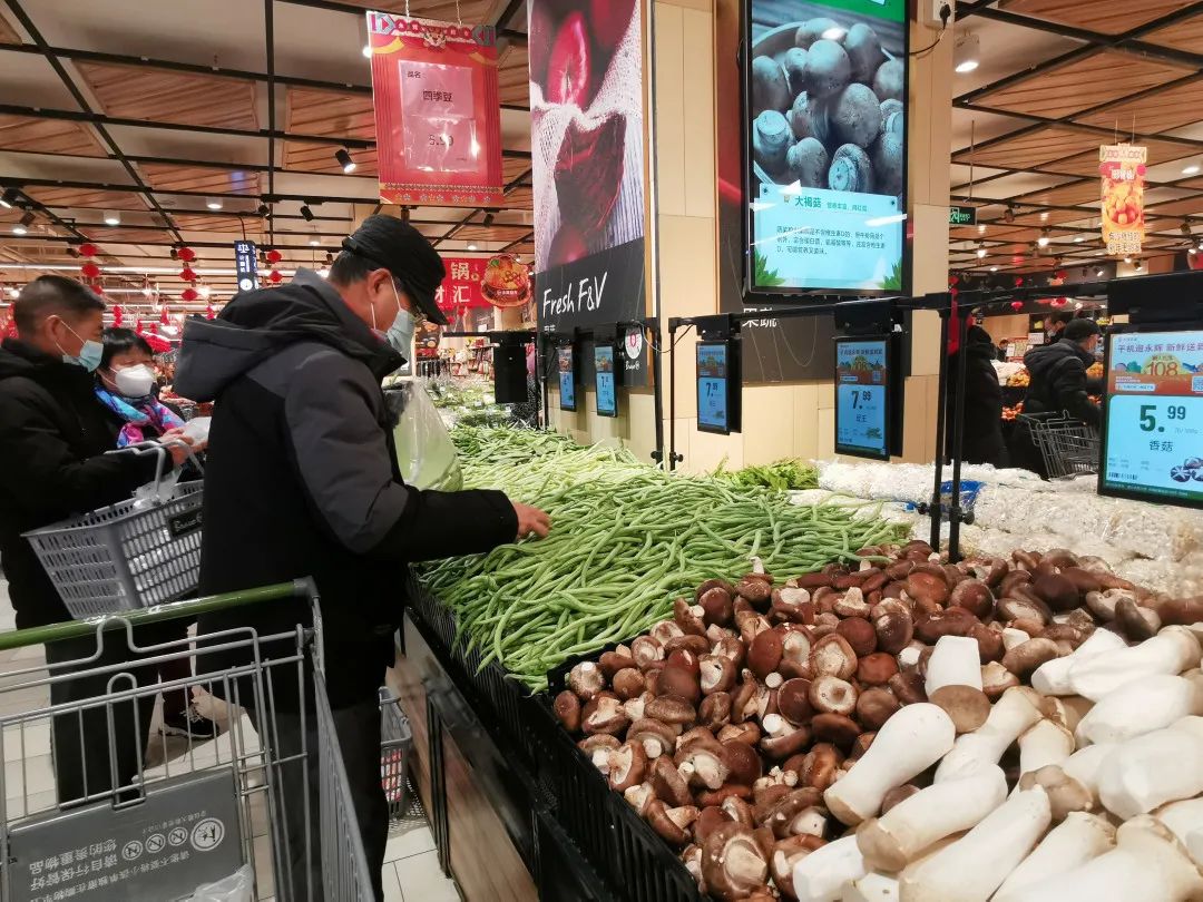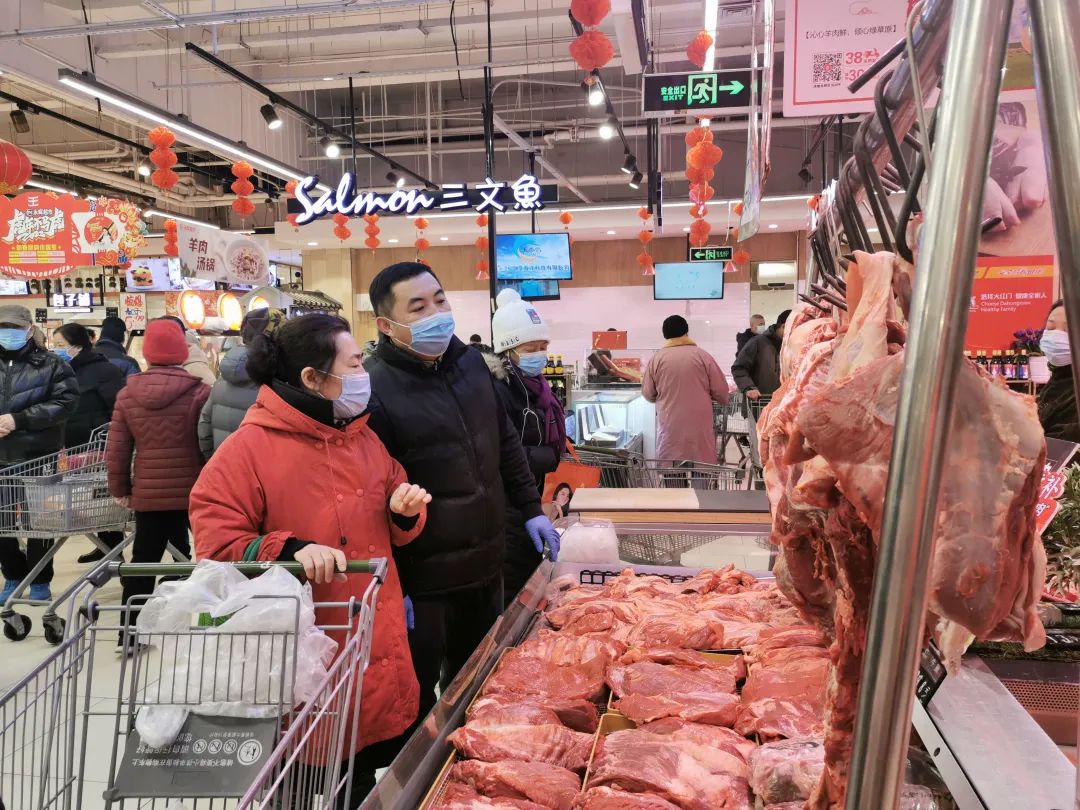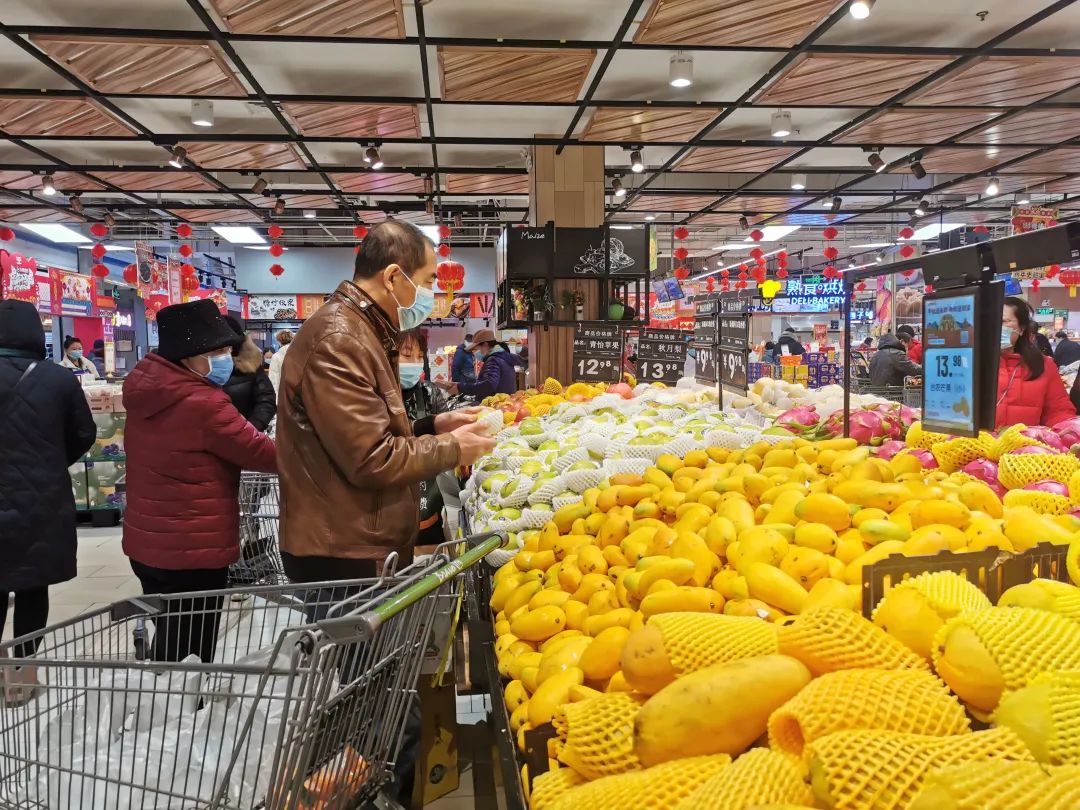 “临近春节,销售量有所增长,但价格方面一直没有大的波动和变化。店内所有进口冷链商品单独存放并且二维码公示,接触冷链人员每周一次核酸检测,店铺其他人员每14天一次核酸检测,每两个小时对卖场重点区域进行消毒。参考去年春节供应量,已加大蔬果肉类等采购备货,尽全力保障市民节日消费需求。”物美超市相关负责人说。