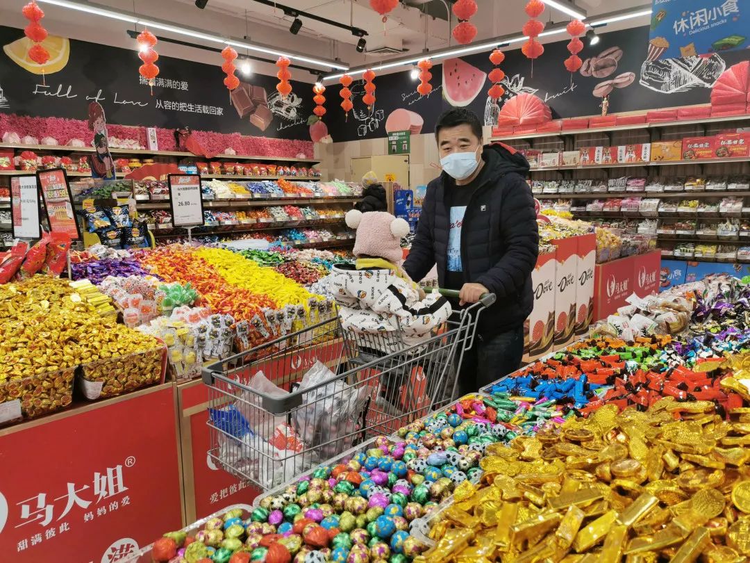 走进物美超市古城店,消费者自觉佩戴口罩,扫码测温。货架上零食、礼盒琳琅满目,摆放井然有序,居民挑选年货、排队付款,采买秩序井然。