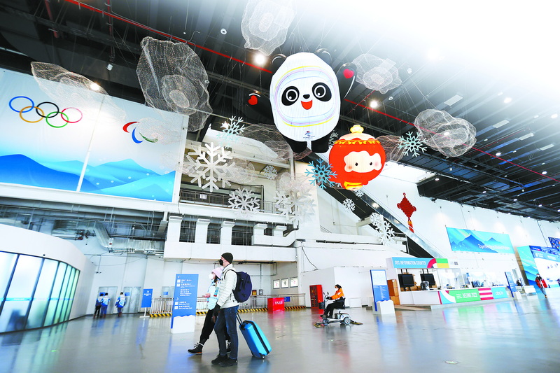 主媒体中心大厅顶部装饰着冰墩墩、雪容融。视觉中国 供图
