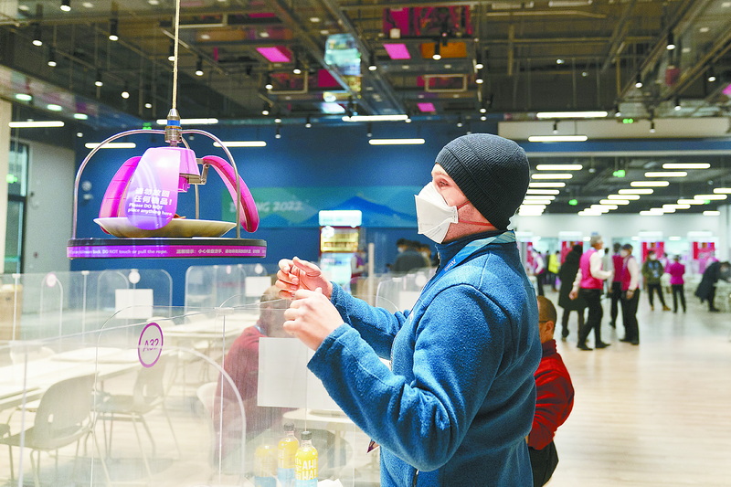 主媒体中心用餐区,来自加拿大的技术人员伸手去拿自动配送的午餐。视觉中国供图